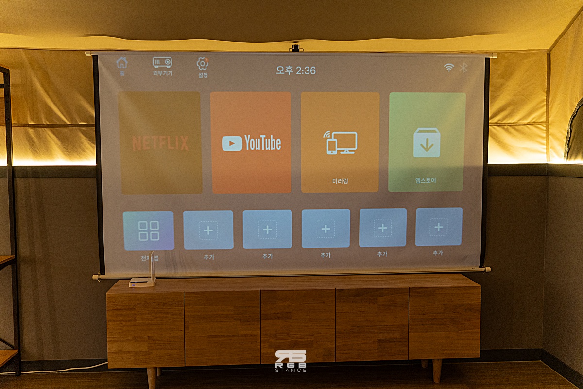 여기에 빔프로젝터가 있어서 가족단위로 놀러온다면 더욱 편하게 즐길 수 있게 되어 있다는 점이 다른 글램핑들과는 차별화된 느낌이다. 그리고, 침대는 매우 편안하며, 침구류 역시 새것에다가 매번 세탁을 하는 듯 뽀송뽀송하다. 참고로, 에어매트로 되어 있는 추가베드를 이용할 수 있다. 또한, 인원수에 맞춰 일반 타올과 샤워타올까지 준비를 해준다는 점이 너무나 편리하다.