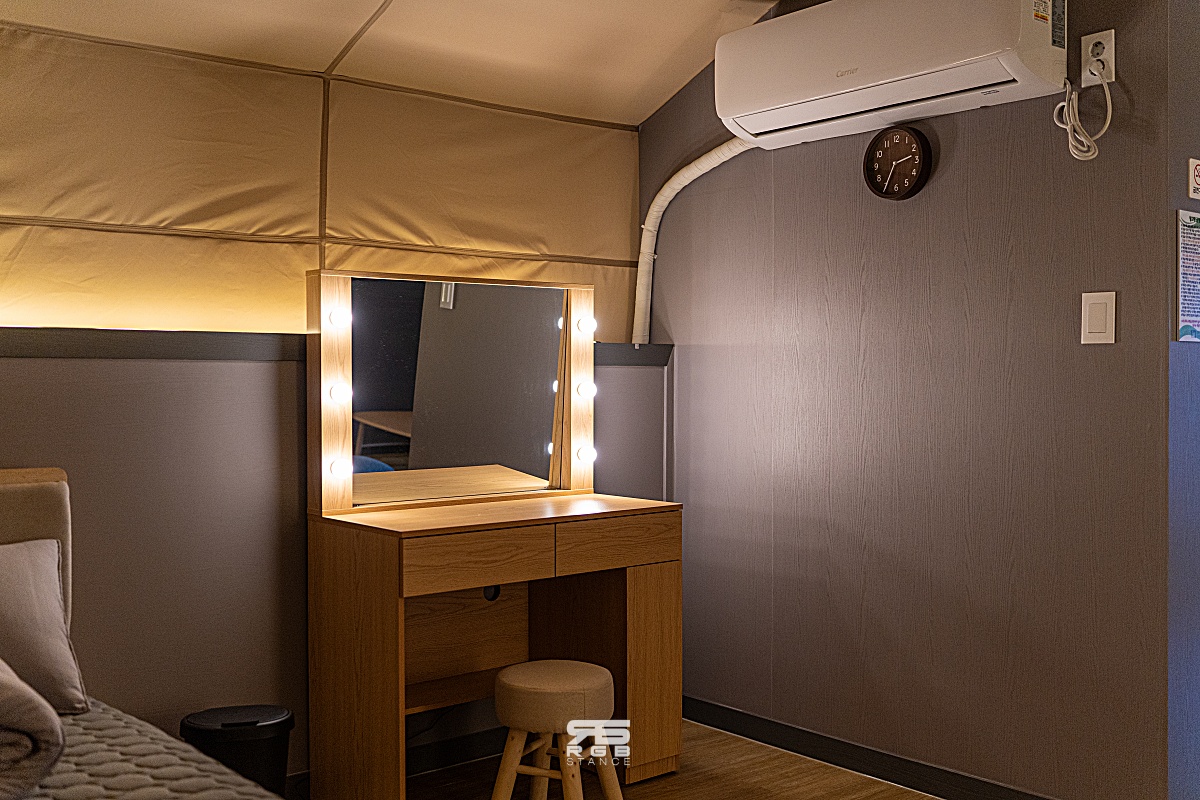 그리고, 에어컨을 비롯해서 바닥 온돌 시스템까지 갖춰져 있어서 계절과 상관업이 언제나 편안하게 이용할 수 있다는 점과 은은한 조명들이 가득해 호텔 같은 편안함이 있다는 점 또한 여기 망고땡 글램핑장의 매력이다.