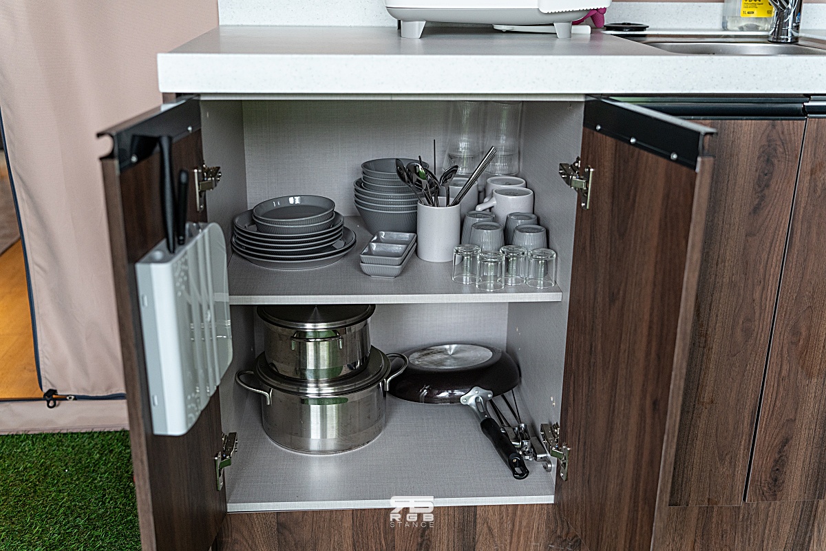 예약한 곳은 4인용 글램핑인 B동인데, 편하게 바로 옆에 주차를 하고 들어가니 편안한 캠핑체어에서부터 불멍 화로와 온수보일러, 냉장고, 커피포트, 전기밥솥, 전자레인지 등이 있으며, 식사를 위한 접시와 대접, 집게, 가위 등기 갖춰져 있어 따로 먹고 마실 것만 준비하면 되는 수준이었다. 또한, 안쪽에는 에어컨과 함께 호텔처럼 쾌적한 화장실이 개별로 있어 더욱 편리하다.