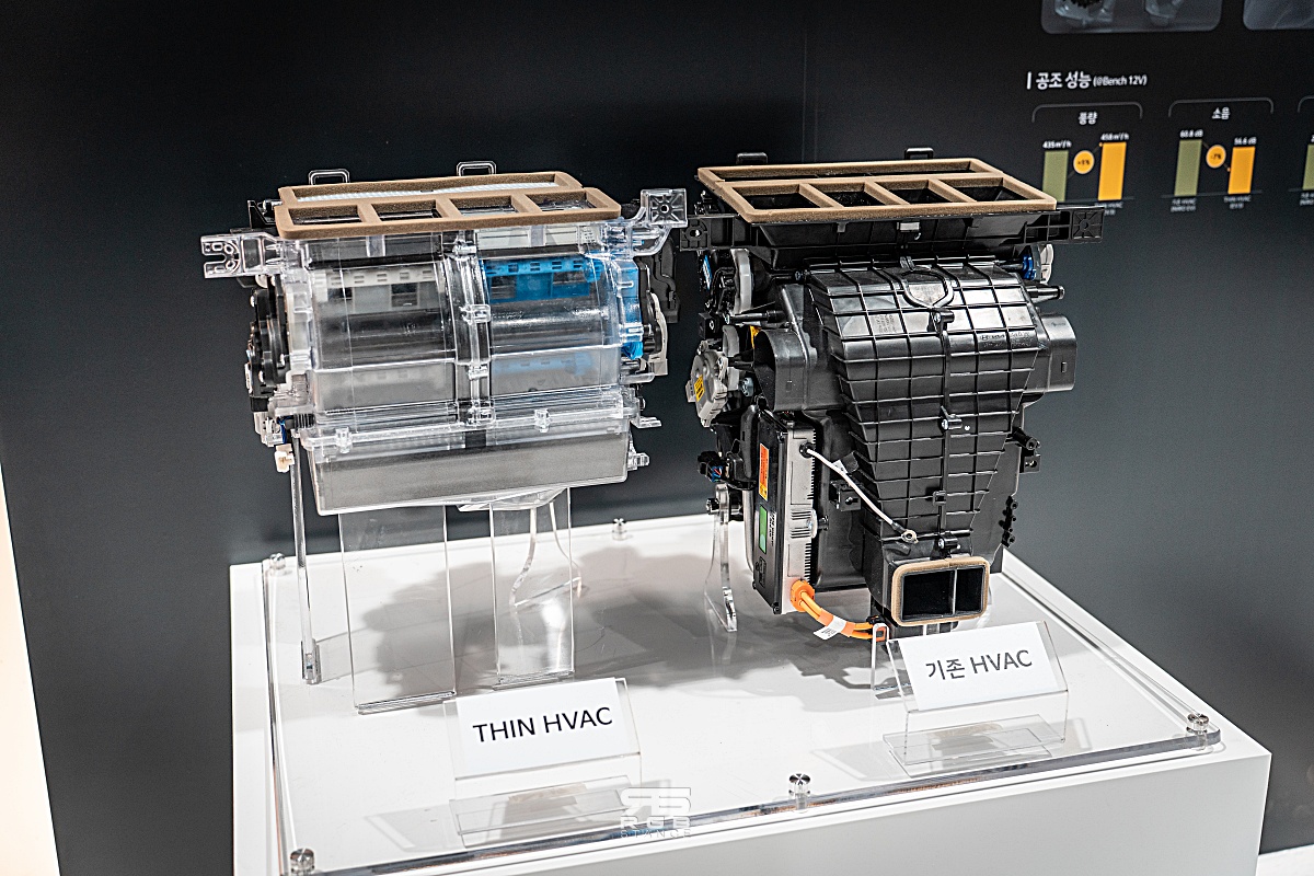 THIN HVAC 에 주목할 이유는 크기가 혁신적으로 줄어들었다는 점이다. 이를 통해 실내 거주 공간을 더욱 넓게 활용할 수 있는 기술인데, 기존 공조 시스템 내부의 열교환기 배치를 세로형에서 가로 적층형으로 바꾸고, 내부 도어 구동 방식을 회전식에서 슬라이딩식으로 변경해 기존 시스템 대비 상하 크기를 33% 줄여 승객 발 거주 공간을 동승석 기준 6cm 더 넓혔다. 이렇게 크기를 줄이면서도 풍량을 증가시키고 소음과 소비전력을 낮췄다는 점에서 주목할 만한 기술이다.