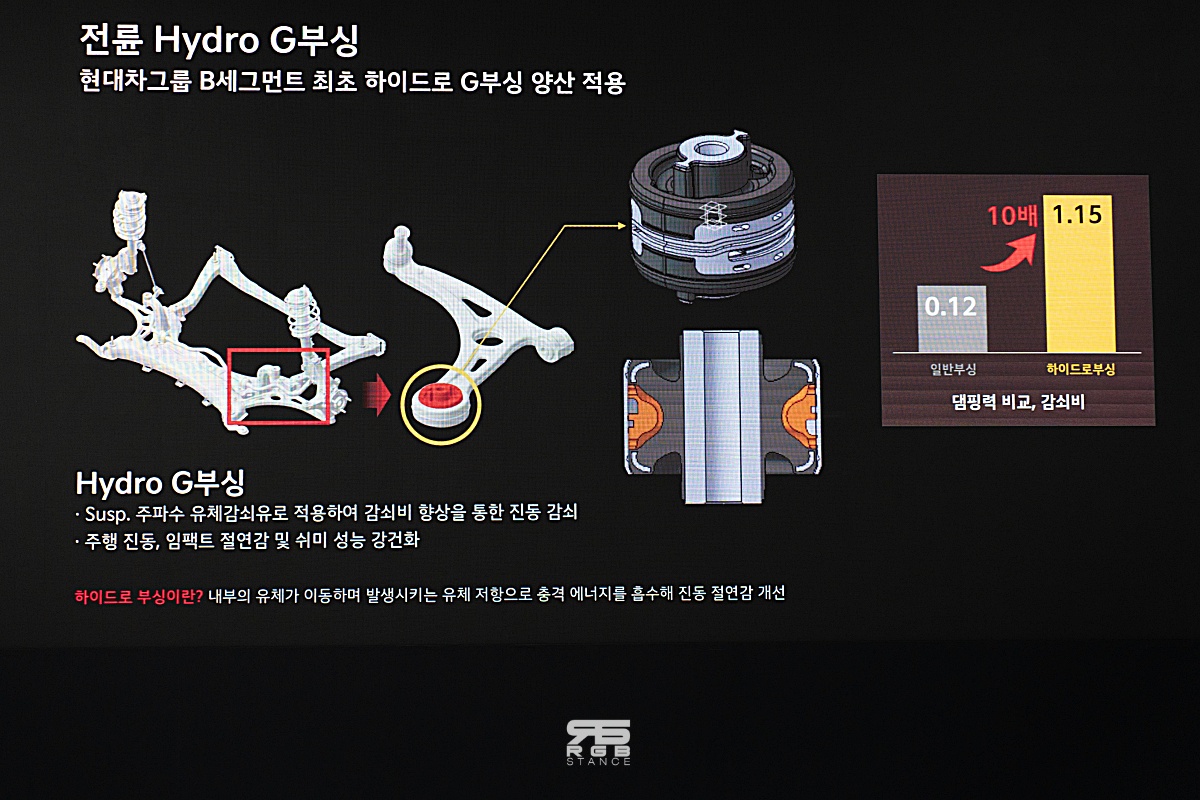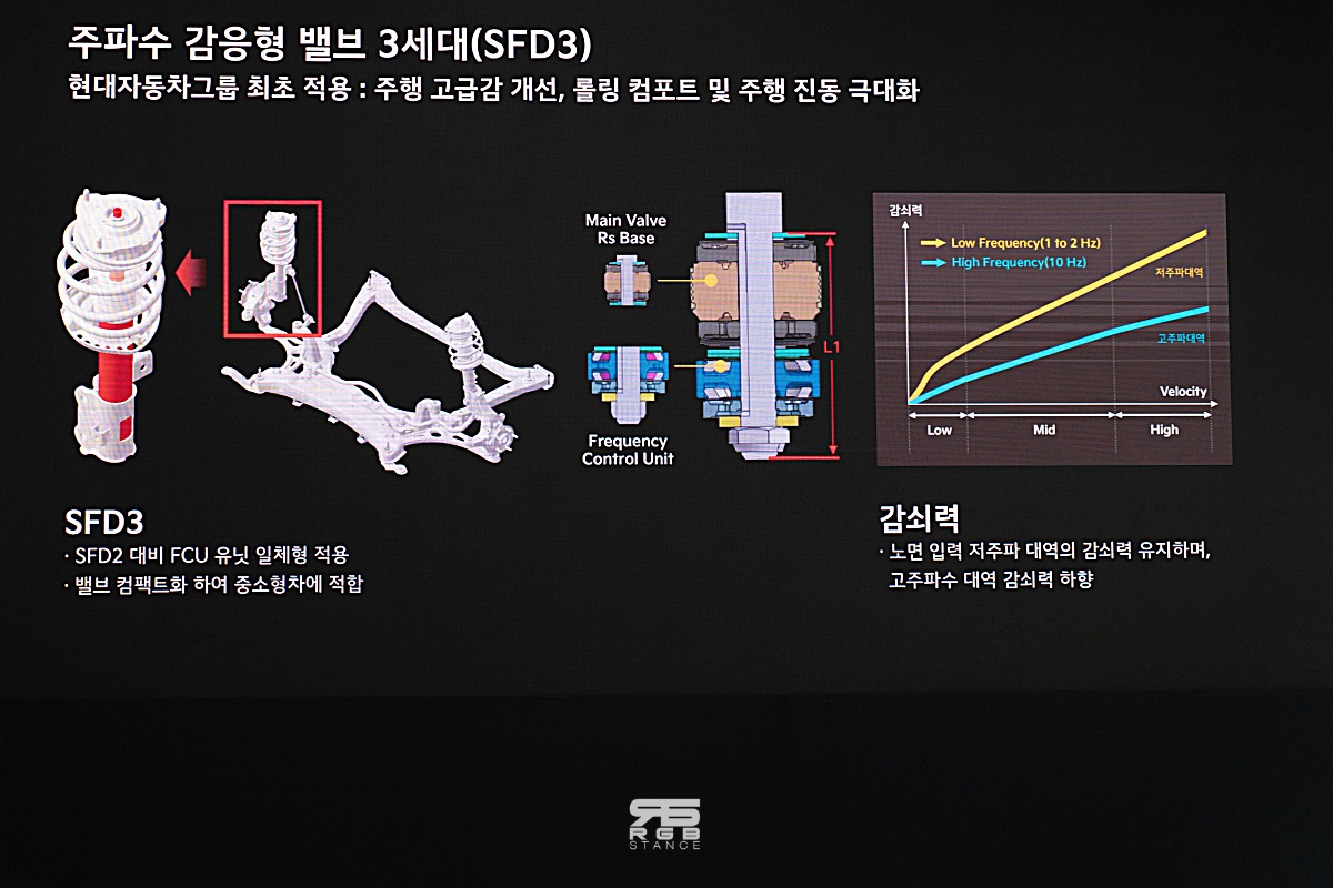 전기차의 단점 중 하나로 꼽히던 ‘승차감’ 을 대폭 향상시킨 ‘3세대 주파수 감응형 밸브’ 기술 역시 주목할 만하다. 중소형 차급에 적합하게 개발된 주파수 감응형 밸브는 주로 고주파수 대역에서 형성되는 노면 주행 진동을 줄이기 위해 고주파수 진동을 감지할 경우, 진동을 더 흡수할 수 있도록 감쇠력을 조절하는데, 여기에 하이드로 G 부싱(내부의 유체가 이동하며 발생시키는 유체 저항으로 충격 에너지를 흡수해 진동 절연감을 개선하는 부품)을 적용해 일반 부싱 대비 충격 흡수 능력을 10배 높여 승차감을 강화했다. 이 외에도 후륜쪽에 멤버스테이를 적용하고 L-브라켓을 추가해 차체의 구조강성을 강화해 차량 응답성과 핸들링 성능을 향상시켰다는 점에서 주목할 만한 기술이다.