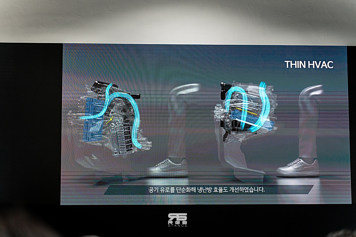 THIN HVAC 에 주목할 이유는 크기가 혁신적으로 줄어들었다는 점이다. 이를 통해 실내 거주 공간을 더욱 넓게 활용할 수 있는 기술인데, 기존 공조 시스템 내부의 열교환기 배치를 세로형에서 가로 적층형으로 바꾸고, 내부 도어 구동 방식을 회전식에서 슬라이딩식으로 변경해 기존 시스템 대비 상하 크기를 33% 줄여 승객 발 거주 공간을 동승석 기준 6cm 더 넓혔다. 이렇게 크기를 줄이면서도 풍량을 증가시키고 소음과 소비전력을 낮췄다는 점에서 주목할 만한 기술이다.
