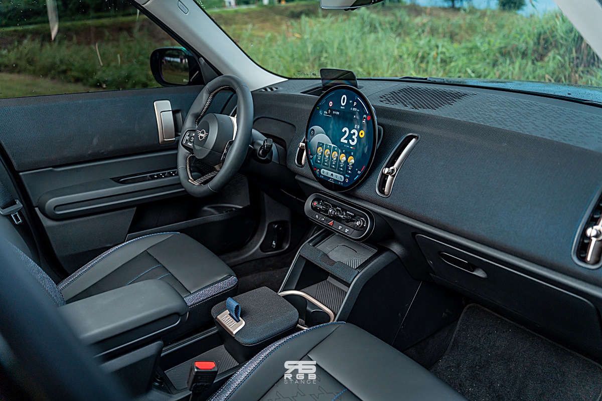 기존 미니 오너라면 시동 버튼이 헷갈릴 수 있다. 열쇠를 돌리는 방식처럼 작동되며, 바로 왼쪽에기어 변속 버튼이 있다. 직관성을 띈 구성으로 사용하기 어렵지는 않다. 그리고, 드라이빙의 손맛을 느끼게 해줄 스티어링 휠은 조금 작아졌는데, 클래식하면서도 모던하다. 3스포크 형태를 띄고 있지만, 가운데는 패브릭 스트랩으로 되어 있다는 점이 미니스러운 위트 포인트다.