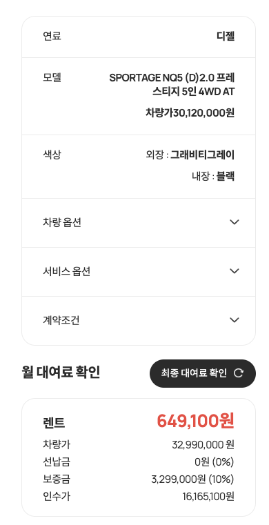 현재 SK 렌터카에서 선택할 수 있는 스포티지는 2.0 디젤 4WD 프레스티지 모델로, 컨비니언스, 12.3인치 내비게이션 등이 포함되어 있다. 월 렌탈료는 앞서 설명한대로 월 528,000 원이며, 1일로 계산시 17,600 원으로 내차처럼 이용할 수 있다는 점이다.