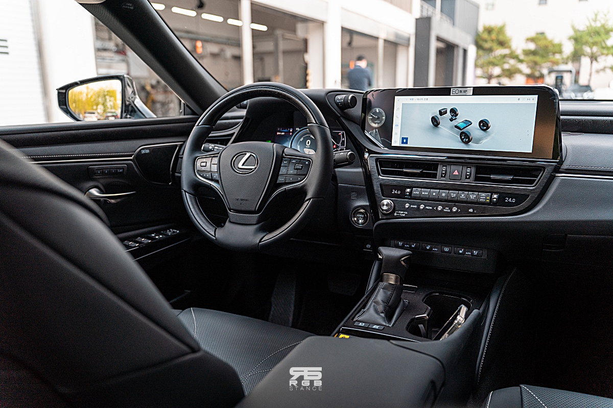실내는 블랙 우드그레인을 통해 고급스러우며, 렉서스만의 독특한 비대칭 구조를 와이드하게 배치하면서도 사용자 중심의 ‘시트 인 컨트롤’ 콘셉트를 통해 운전이 편안한 구조로 보이고 있다. 12.3인치의 터치식 대형 디스플레이는 내비게이션 및 스트리밍 뮤직, 유플러스 모바일 TV 등 다양한 인포테인먼트를 즐길 수 있고, 소모품 정보 및 교체주기 같은 차량관리에 대한 정보도 확인할 수 있다.