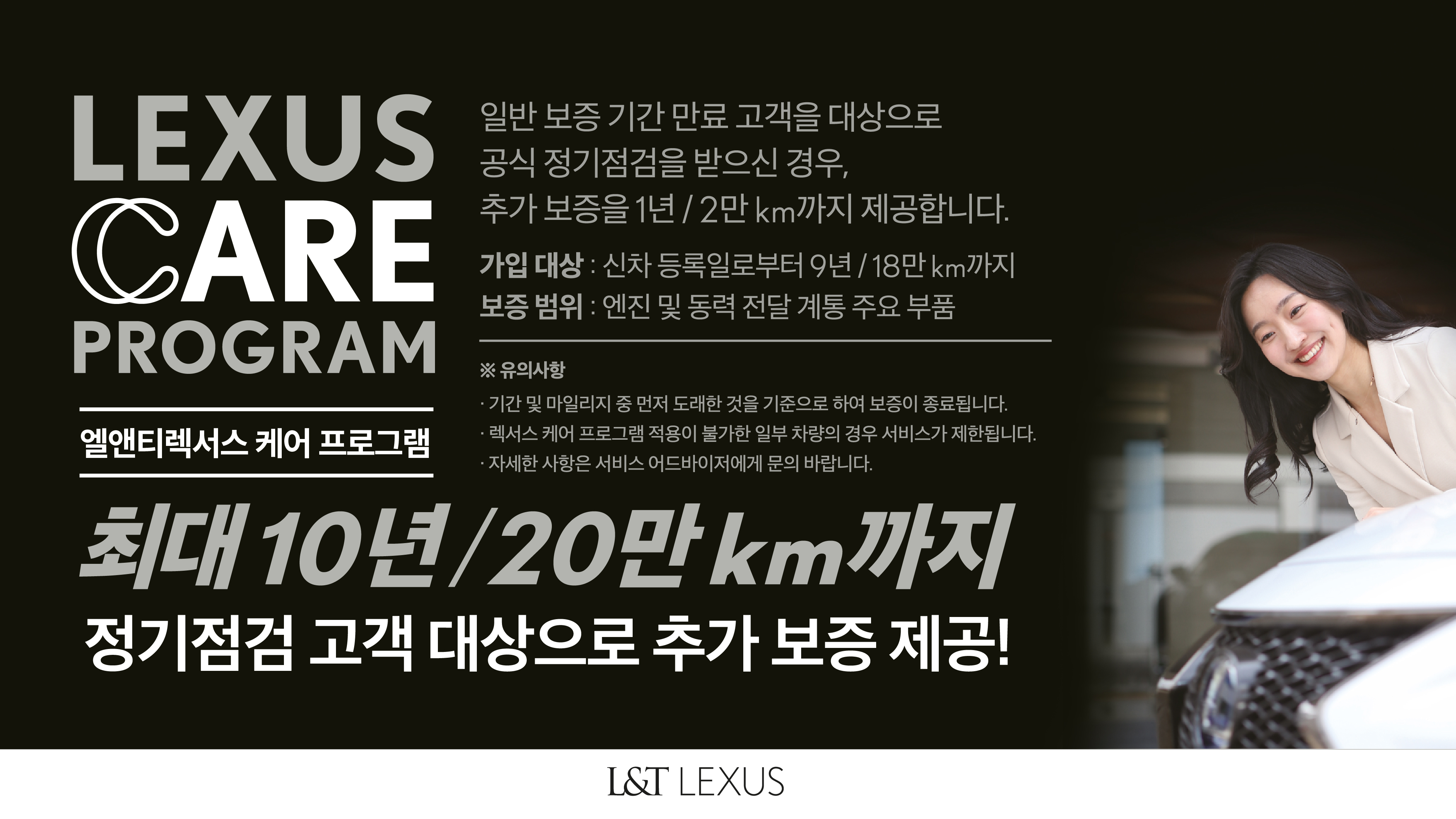 안정적인 승차감과 높은 효율. 그리고 렉서스만의 뛰어난 내구성은 이미 인기 요소이긴 하지만, 렉서스는 ‘L-Care’ 라는 케어 프로그램을 제공하고 있다. 기본 보증 서비스의 종료 후에 공식 서비스 센터에서 공식 점검을 받으면 1년 혹은 2만Km 까지 엔진 및 동력 전달 계통의 주요 부품에 한해 추가 보증 서비스를 제공하는 것인데, 공식 정기 점검을 받은 차량 중 ‘PASS’ 판정을 받은 차량에 한해 제공되며, 1천만원 한도(부품 및 공임 포함)까지 부담 없이 보증 부품에 대한 교환 및 서비스가 가능하다.