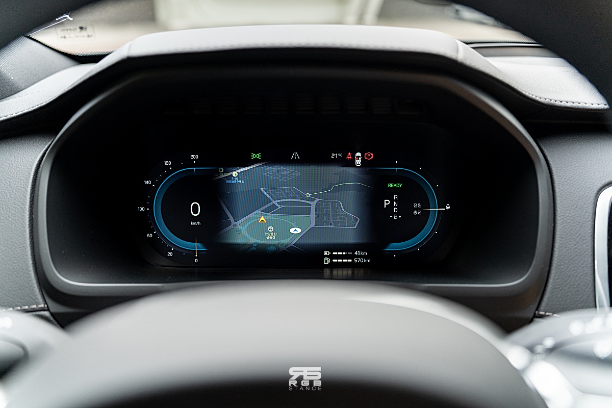 PHEV 모델 답게 계기판에는 주행상황에 따른 EV 모드로 주행이 가능한 거리 및 총 주행가능거리를 보여주고 있으며, 내비게이션까지 연동되어 운전이 더욱 편할 뿐 아니라, 11.0km/L 의 복합연비를 보여주고 있다.