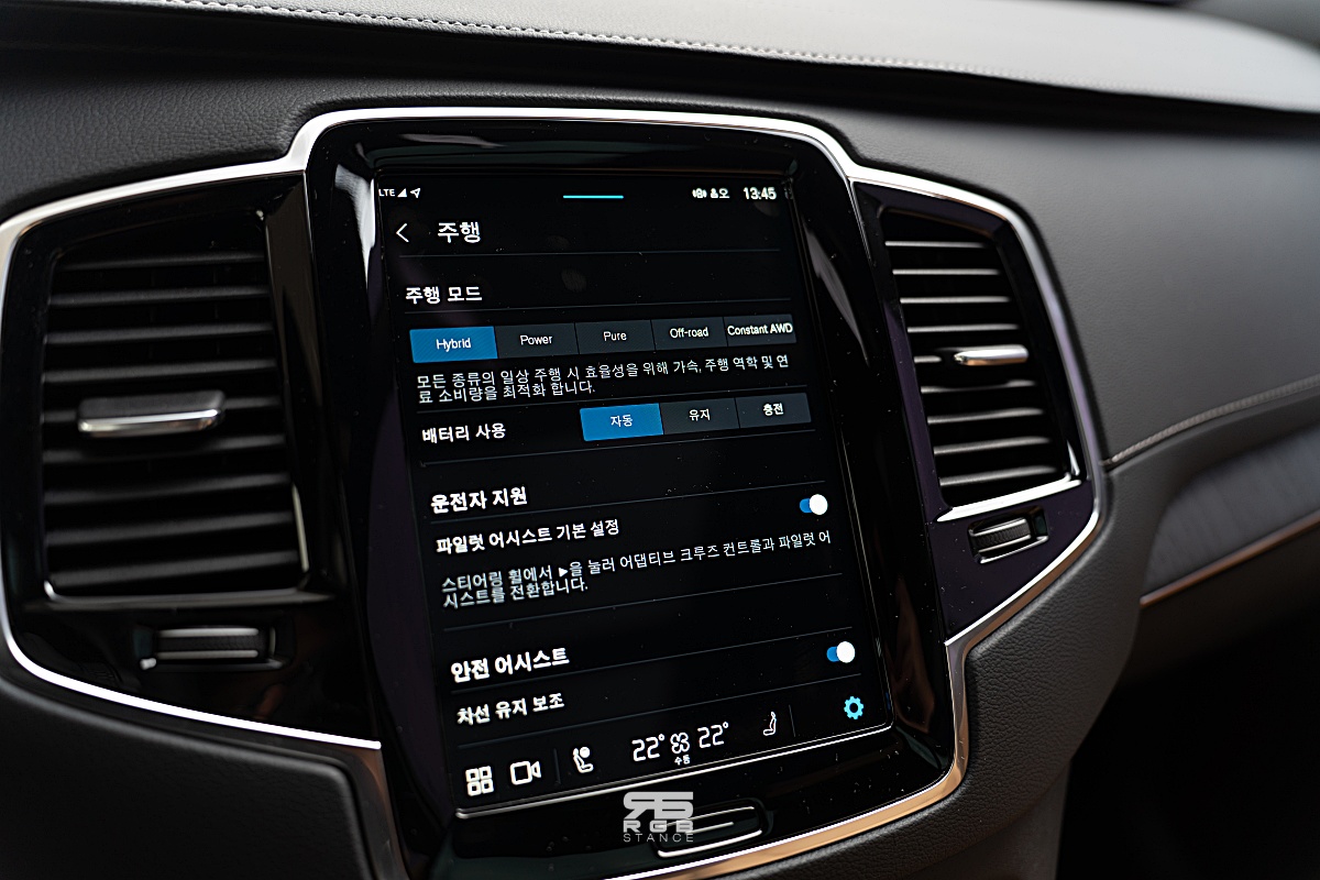 핸들링과 승차감은 볼보다운 편안함과 단단함이다. 고속주행에서도 안정적이면서 편안하다. 코너에서도 SUV 임에도 깔끔하고 안정적으로 돌아나가며, 주행모드를 설정에서 하이브리드, 파워, 오프로드, 콘스탄트 AWD 등 총 5가지 모드로 선택할 수 있고, 에어서스펜션과 스티어링휠 세팅까지도 모두 바뀌게 된다.