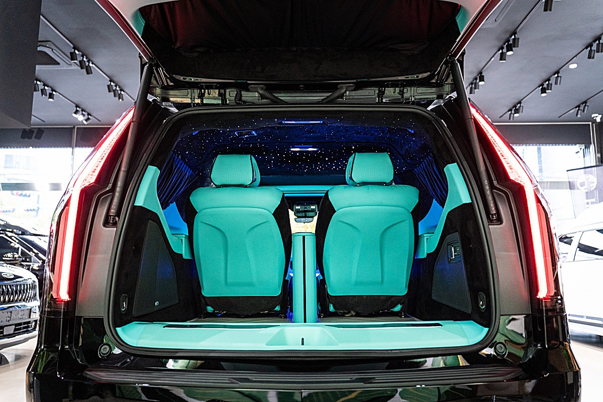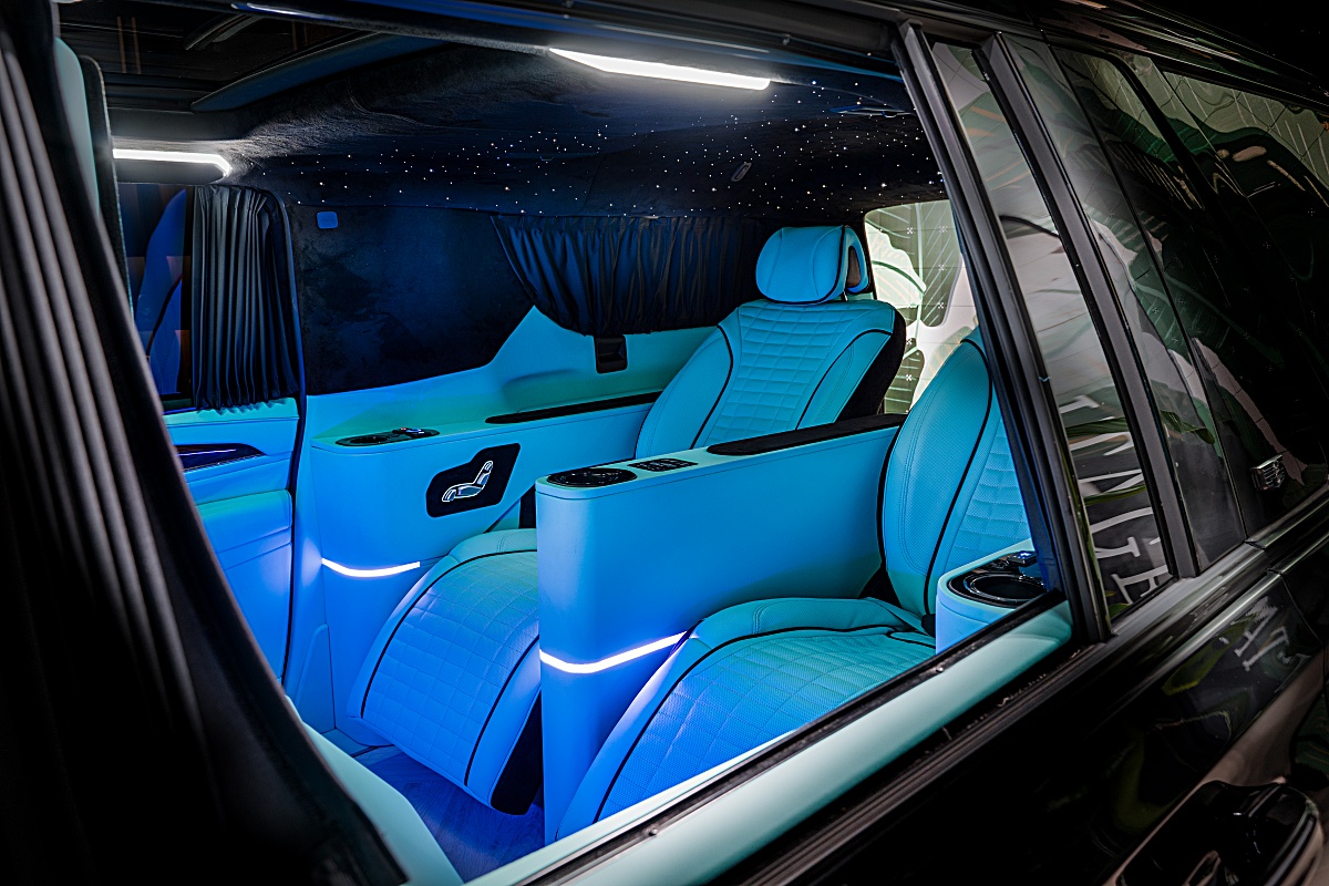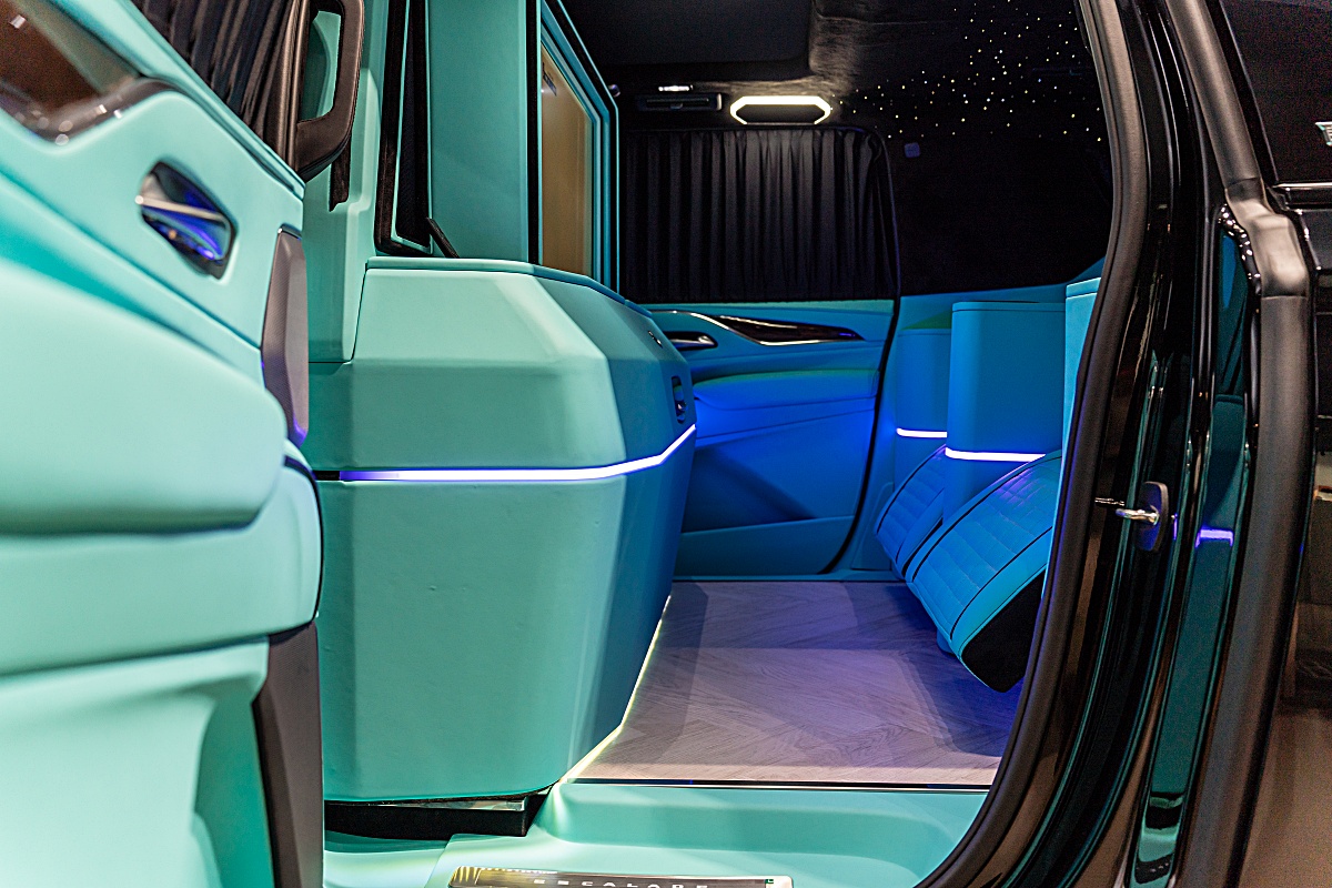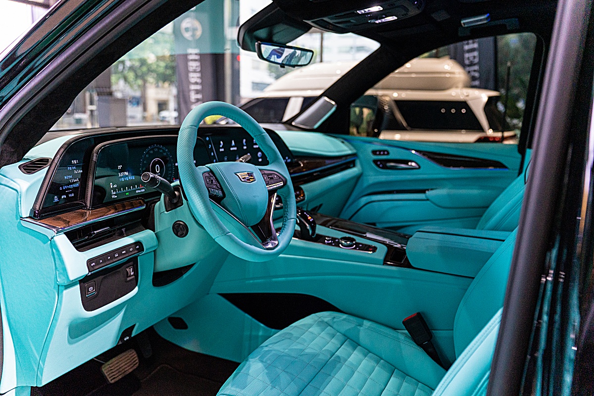 헤리티지 한유에서 제작한 캐딜락 에스컬레이드 ESV 는, 고객의 요청에 따라 실내 컬러 및 구성을 다양하게 꾸밀 수 있는데, 이번에 공개한 에스컬레이드에서는 티파니 민트 컬러에 앰비언트 무드램프, 스타라이트(Star Light) 등을 더해 실내 분위기를 우아하고 고급스럽게 꾸며놓았다.