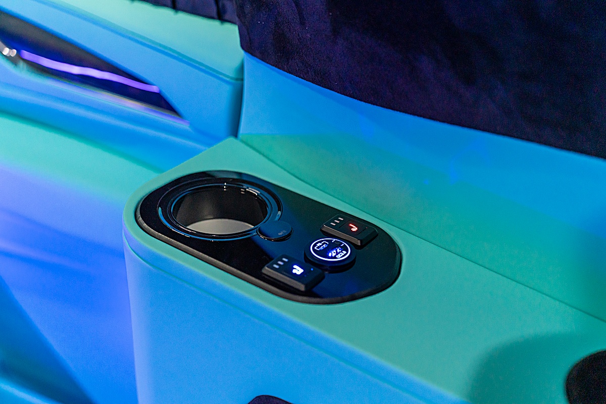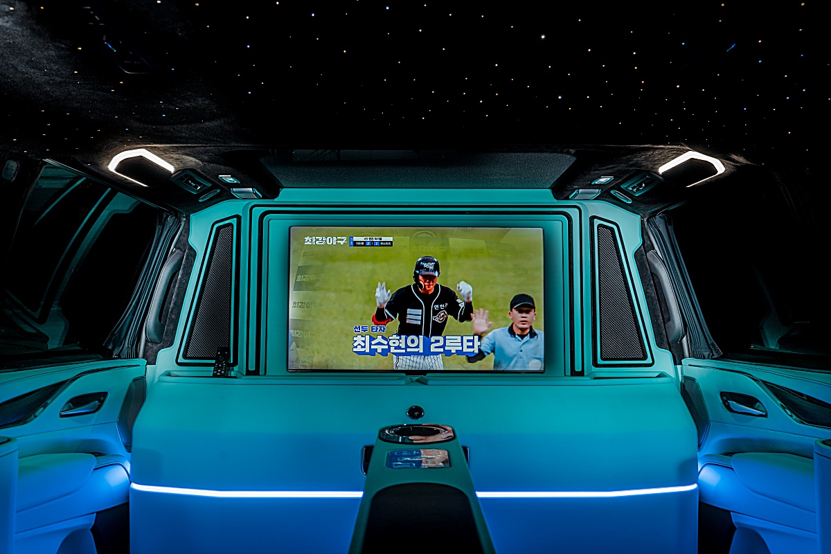 무엇보다 1열과 공간을 나눌 수 있는 것이 큰 특징인데, 비즈니스상 프라이빗한 공간으로 보안을 요구한다면 더욱 확실한 선택이 될 수 있다. 32인치 TV 는 전동식으로 움직일 수 있어서, 1열과의 소통이 필요할 때에는 TV 를 내리고 사용할수도 있다. TV 는 리무진 시트에 있는 버튼을 이용해 편리하게 조작할 수 있다. 컵홀더에는 보온/보냉 기능이 적용되며, 열선 및 통풍시트까지 적용되어 계절과 상관없는 편안함을 경험할 수 있다.