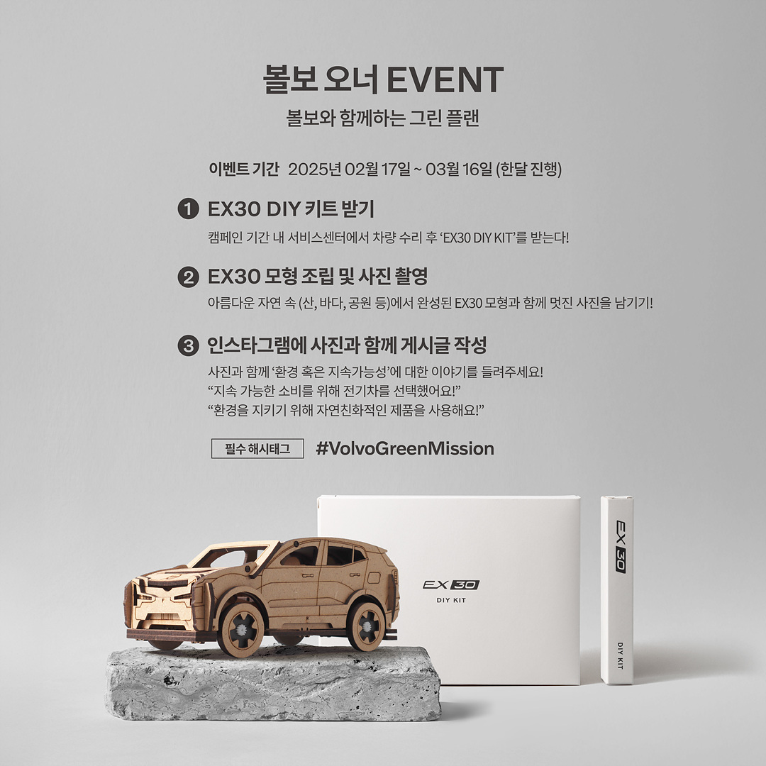 이와 함께 차세대 프리미엄 전기 SUV, 볼보 EX30의 공식 출시를 기념해 서비스 캠페인이 시작되는 2월 17일(월)부터 3월 16일(일)까지 약 한 달간 ‘볼보와 함께하는 그린 플랜’ SNS 이벤트도 진행한다. 이벤트 참여 방법은 서비스센터에서 받은 ‘볼보 EX30 DIY 키트’를 조립한 후, 바다·산·공원 등 자연 속에서 완성된 EX30의 모형과 함께 사진을 촬영하고 #VolvoGreenMission 해시태그와 함께 SNS에 업로드하면 된다. 참여 고객 중 추첨을 통해 총 100명에게 스타벅스 e-기프트카드(3만원 권)를 증정할 예정이다.