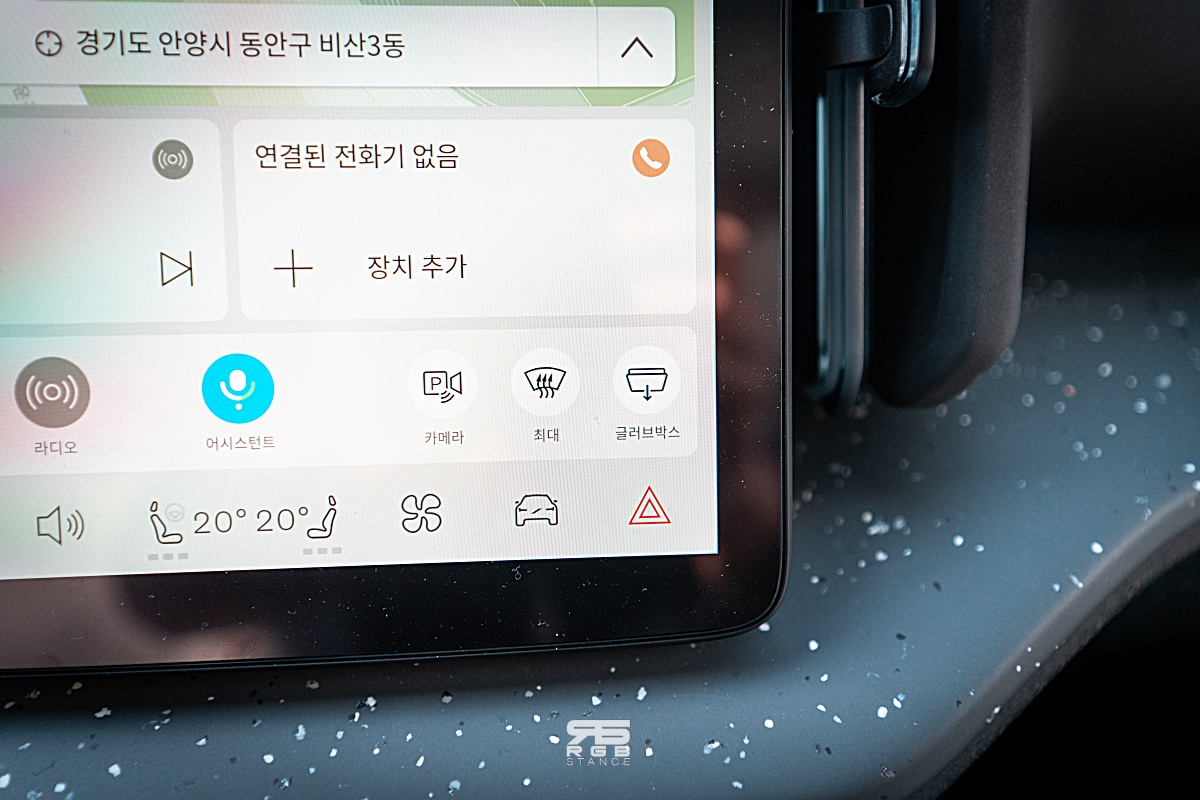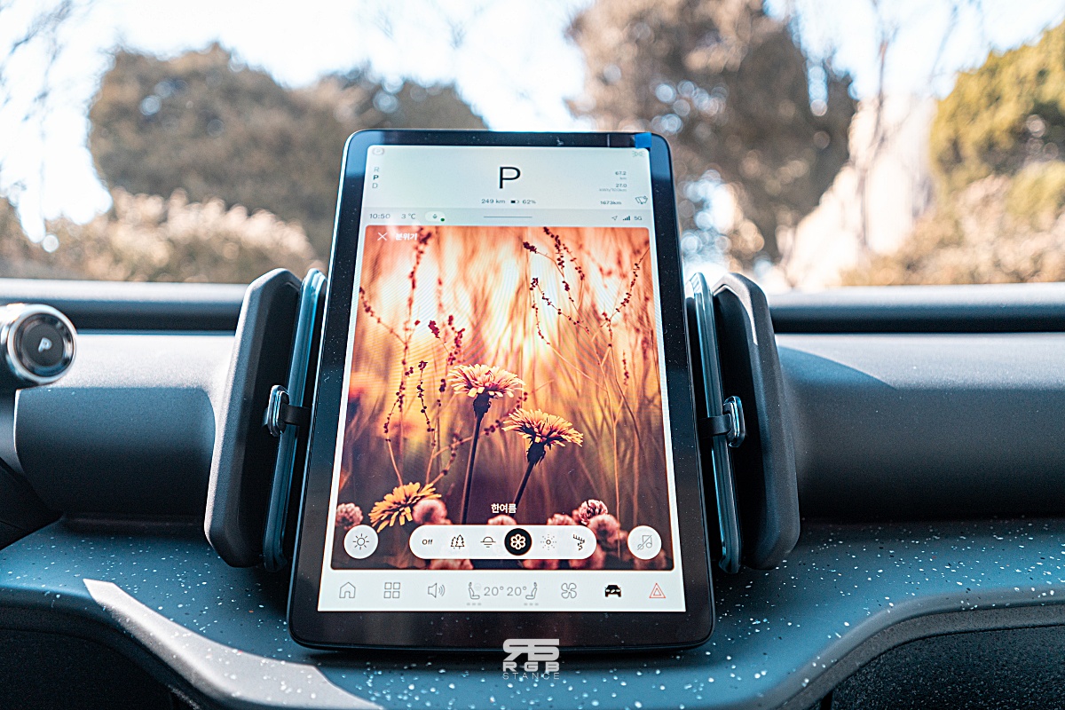 실내에서는 스티어링 휠과 센터 모니터가 눈에 들어온다. 그 외 물리 버튼들은 대거 삭제되었고, 윈도우 버튼은 실내공간 확보를 위해 센터 암레스트에 위치해 있다.