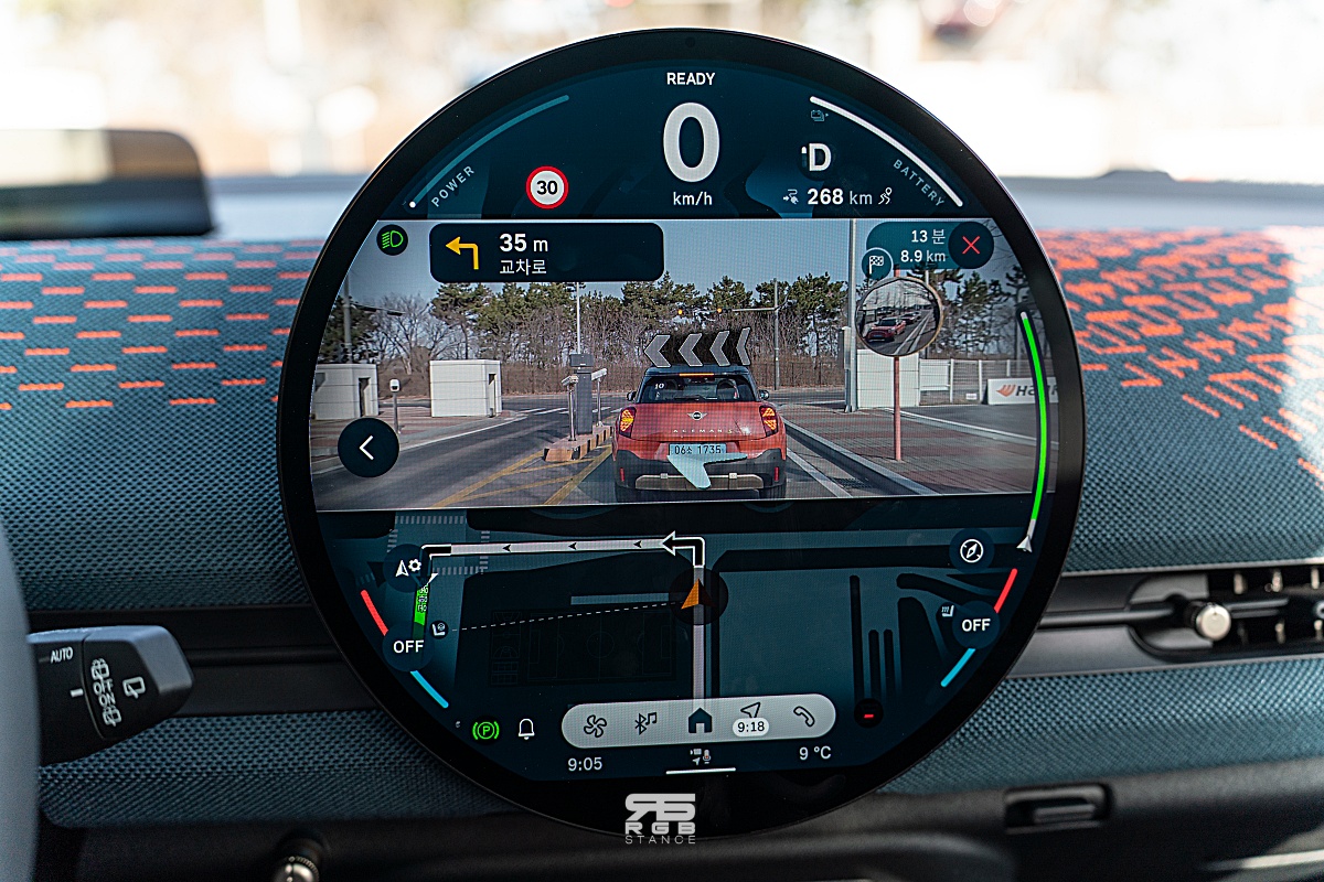 그리고, 서라운드 뷰 및 리모트 3D 뷰 등이 있고, 원형 OLED 디스플레이는 미니의 정체성을 지키면서도 하이테크한 모습을 잘 담아내고 있다. 뿐만 아니라, Tmap 을 사용하면서도 전방 화면도 함께 표시되는 등 운전자의 편의를 많이 고려한 모습들이 인상적이다.