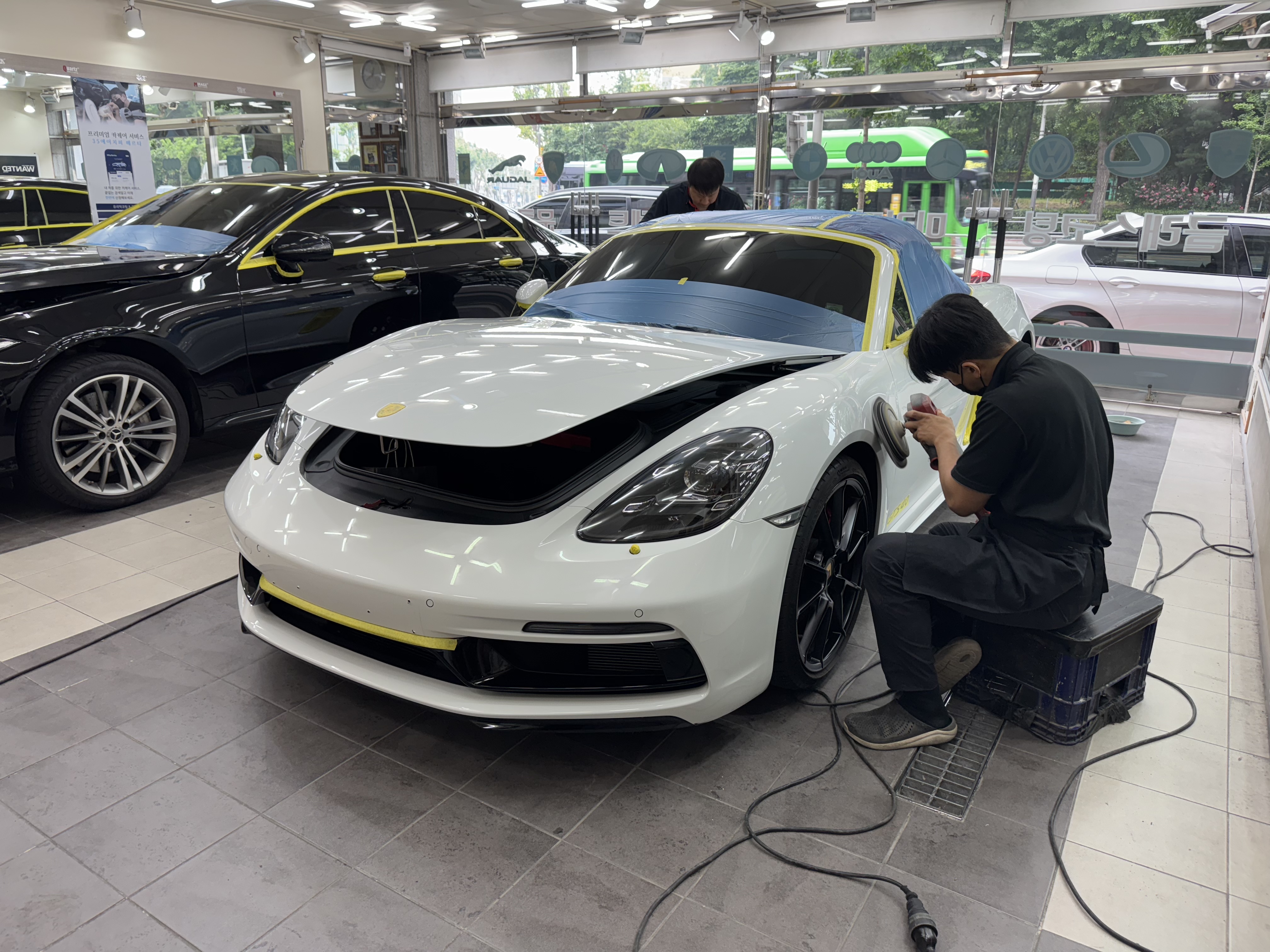 유리막코팅 재시공시에도 신차 유리막코팅처럼 꼼꼼한 마스킹 작업을 해주는 것이 필수적이다. 마스킹 작업을 통해 광택작업을 진행시 플라스틱 같은 소재들의 손상을 방지해야 한다.