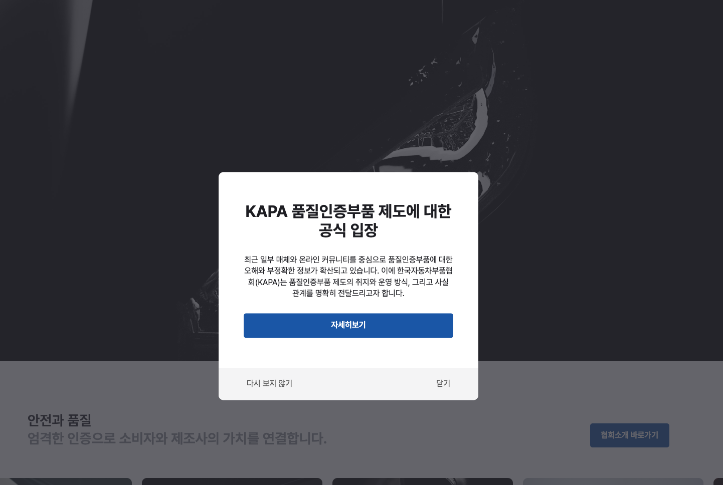 또한, 자동차 제조사에 납품하는 부품업체들의 OEM 제품들도 아니다보니, 소비자 입장에서는 더욱 불안할 수 밖에 없다. KAPA 는 소비자의 권익 보호와 국내 자동차 부품 산업의 지속 가능한 발전을 위해 설립된 비영리 기관이라고 한다. 또한, 건전한 자동차 부품 시장 생태계 조성을 목표로 한다고 하며, 국내 다양한 공인 시험기관들과 긴밀히 협력하여 품질 수준을 관리하며, 소비자 선택의 폭을 넓히고자 한다고 한다.
