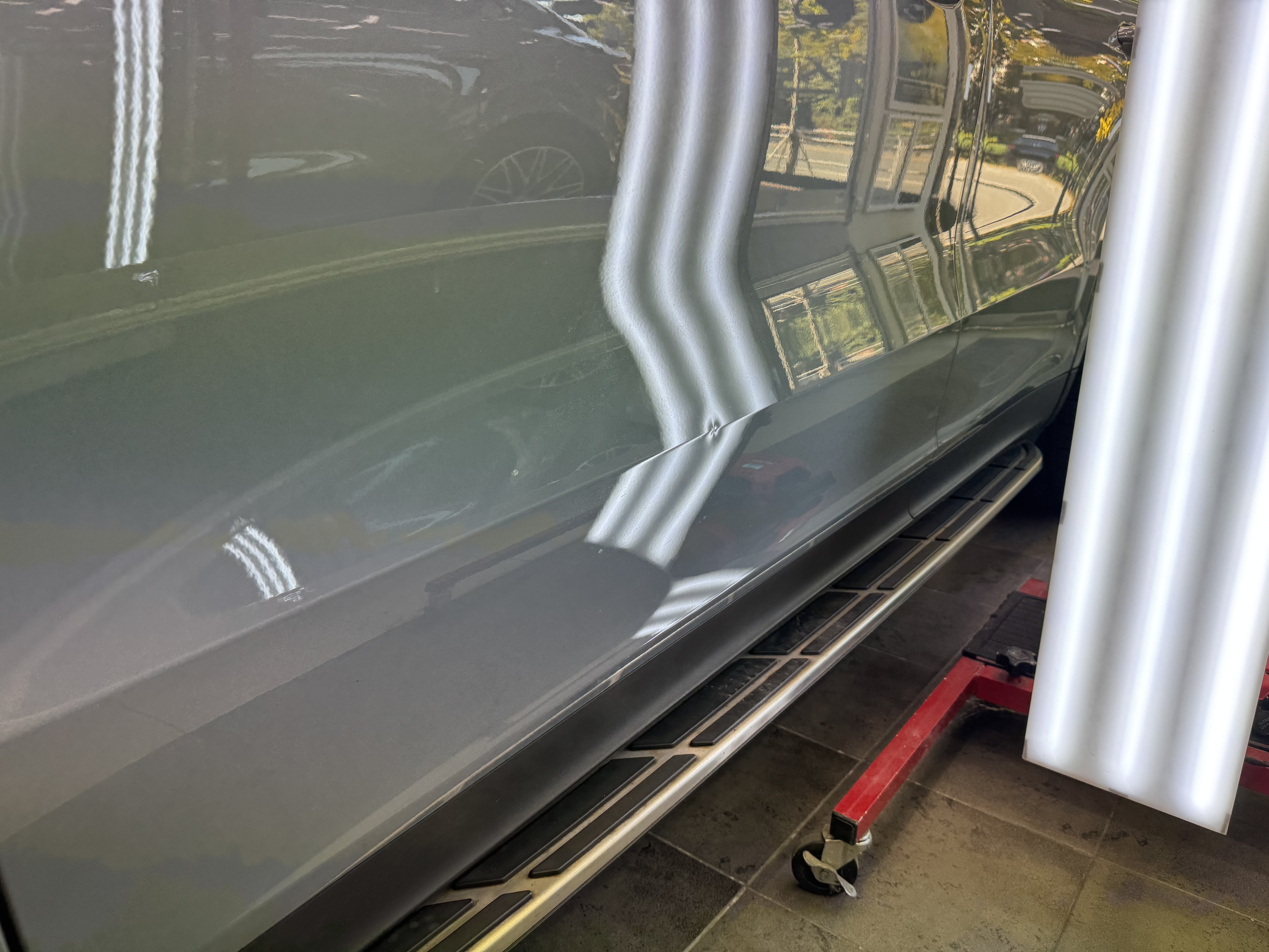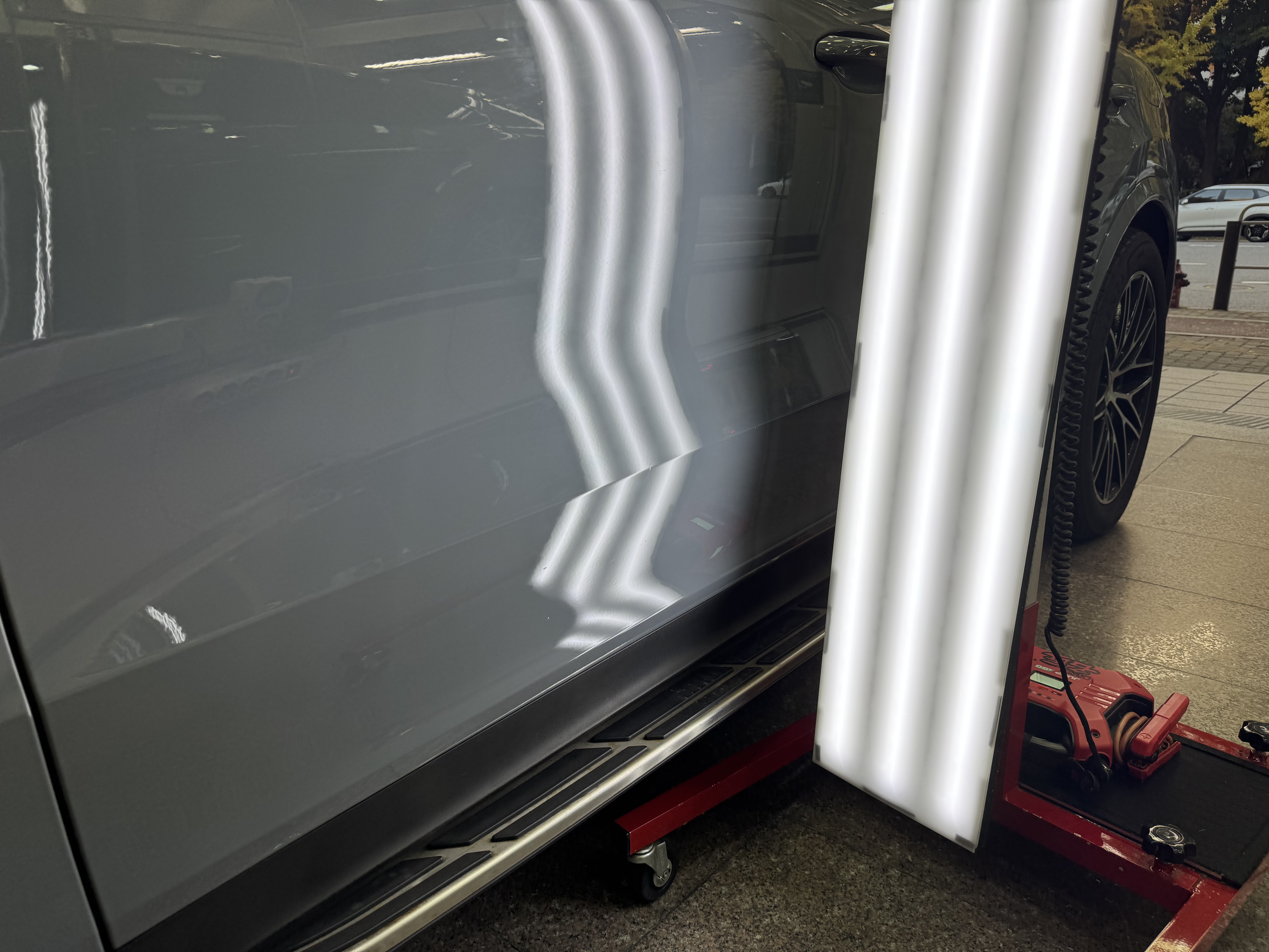 덴트명장에 다양한 차량들이 수리와 광택 등을 맡기는데, 이번에 포르쉐 카이엔의 문콕 덴트수리를 진행, 도어의 하단부 사이드 엣지 부분이 심하게 찍혀 덴트복원수리를 진행했다. 다행히 이정도면 판금도색이 필요한 정도는 아니어서 덴트로 충분히 수리가 가능한 상태.