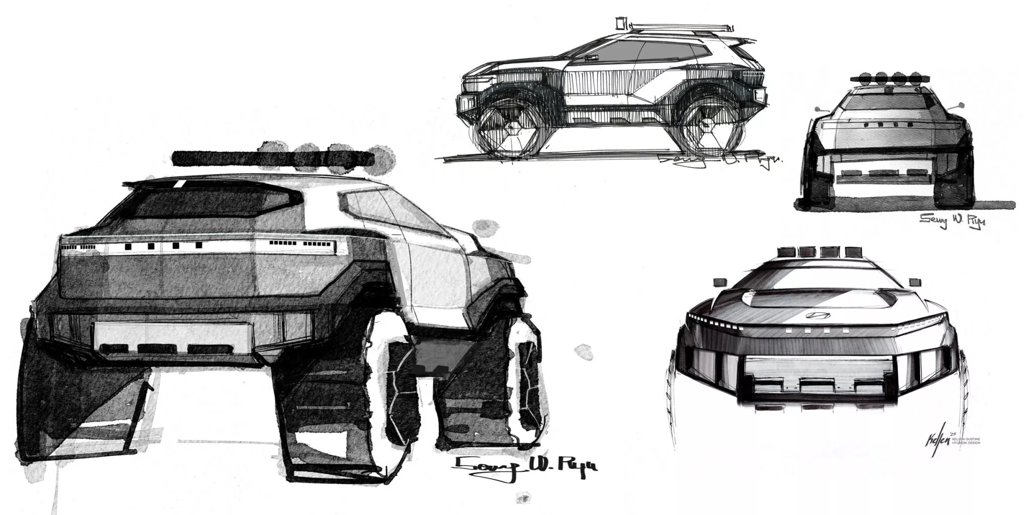 특히, XRT 스타일링 패키지가 더욱 강력하게 진화할 것을 시사하고 있는데, 전면부는 4개의 LED 로 현재 판매중인 수소전기차 '넥소' 를 떠오르게 하고, 짧은 오버행에 볼륨감 있고 공격적인 휀더. 여기에 실용적인 조명을 더해 강인하면서도 오프로드 중심의 아이덴티티를 강조하고 있는 모습이다. 그리고, 전체적으로 밀폐형 구조를 통해 전기차임을 보여주고 있지만 자세한 파워트레인에 대한 언급은 없다.