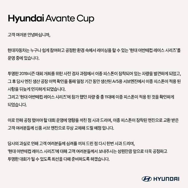 이번 이슈에서 사실 관심을 가질 부분은 경기에 나간 선수들의 차량의 엔진에 대한 문제인데, 이것이 양산차량에서의 문제로 이어지지는 않는다고 한다. 실제로 두 피스톤은 호환 사용이 가능한 부분이며, 압축비가 다르다고 해서 노킹(Knocking)* 현상이 발생되지는 않는다고 한다. 9.5 : 1 의 압축비와 10 : 1 의 압축비는 ECU 에서 제어 가능한 부분이라는 설명이다. 따라서, 이번 사과는 '현대 아반떼컵 레이스 시리즈' 에 참가한 차량 중 11대에 대해 정상적인 피스톤이 장착되지 않아 공정해야 할 부분에서 출력과 토크에 차이가 발생한 부분에 대한 것이며, A/S 용으로 제작된 엔진에서의 조립문제인 만큼, 일반 양산차량에서는 신경 쓸 필요가 없다고 보면 된다.