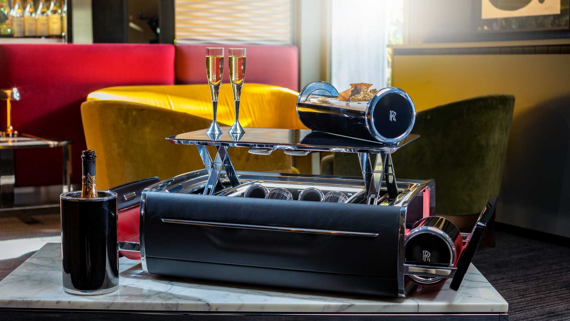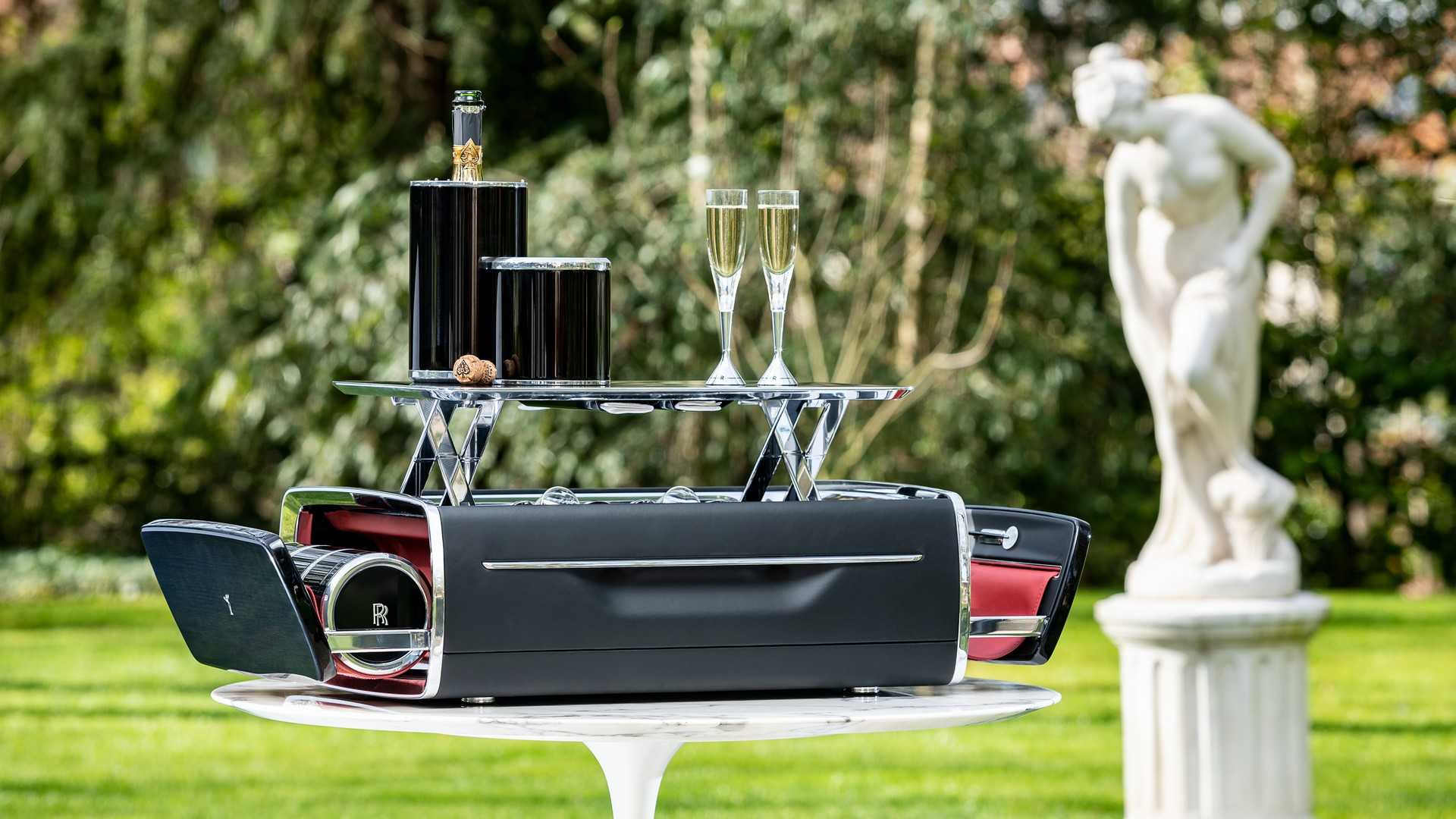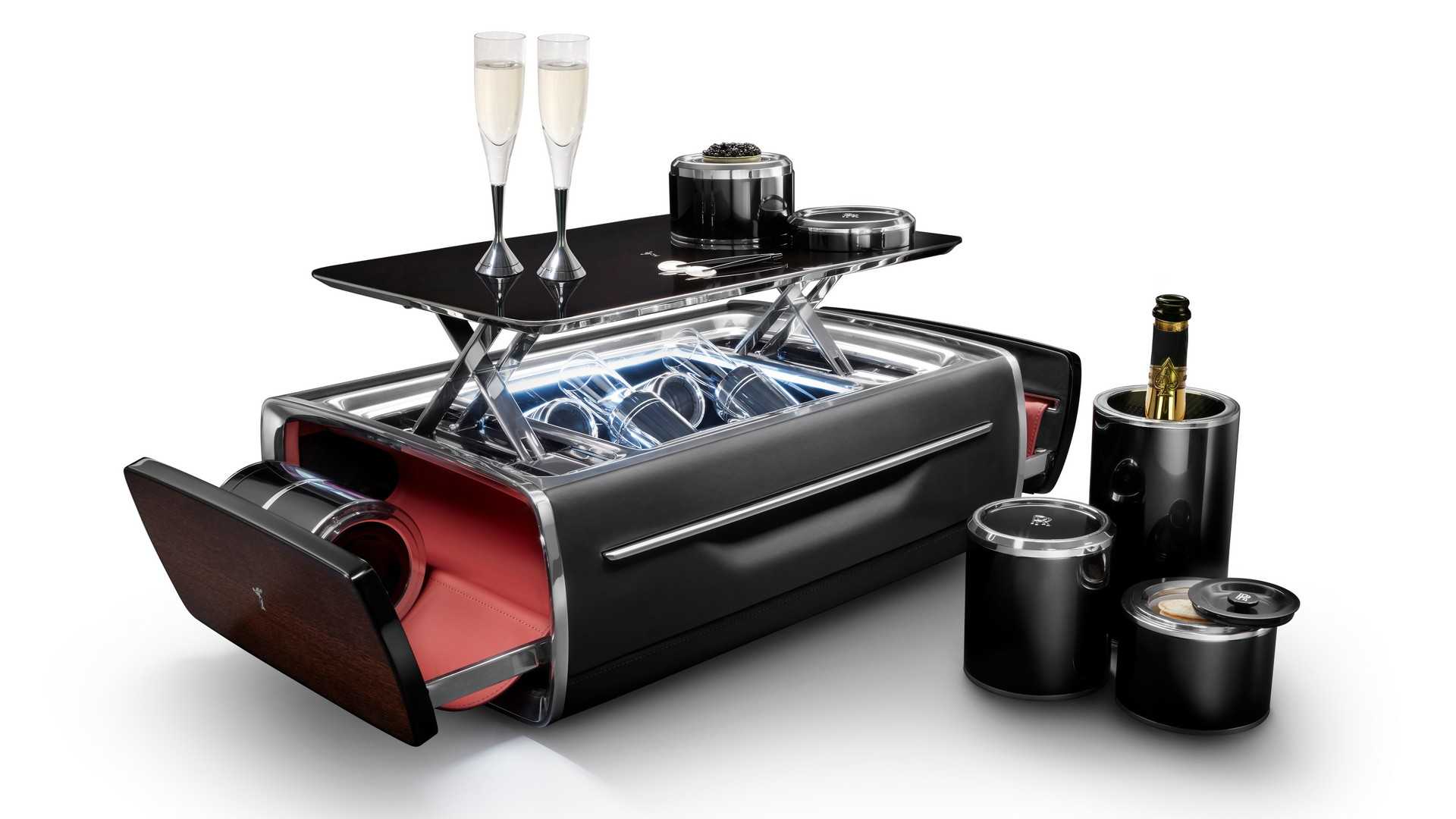 또한, 버튼을 눌러, 양쪽 측면 및 상판을 열면, 4개의 샴페인 잔이 롤스로이스의 V12 엔진을 연상케 하는 배열로 비스듬히 꽂혀 있으며, 캐비어의 손상을 최소화하는 전용 스푼을 포함해, 최적의 온도로 샴페인과 캐비어를 보관해준다. 이 샴페인 케이스의 가격은 한화로 약 5,552만원이다.