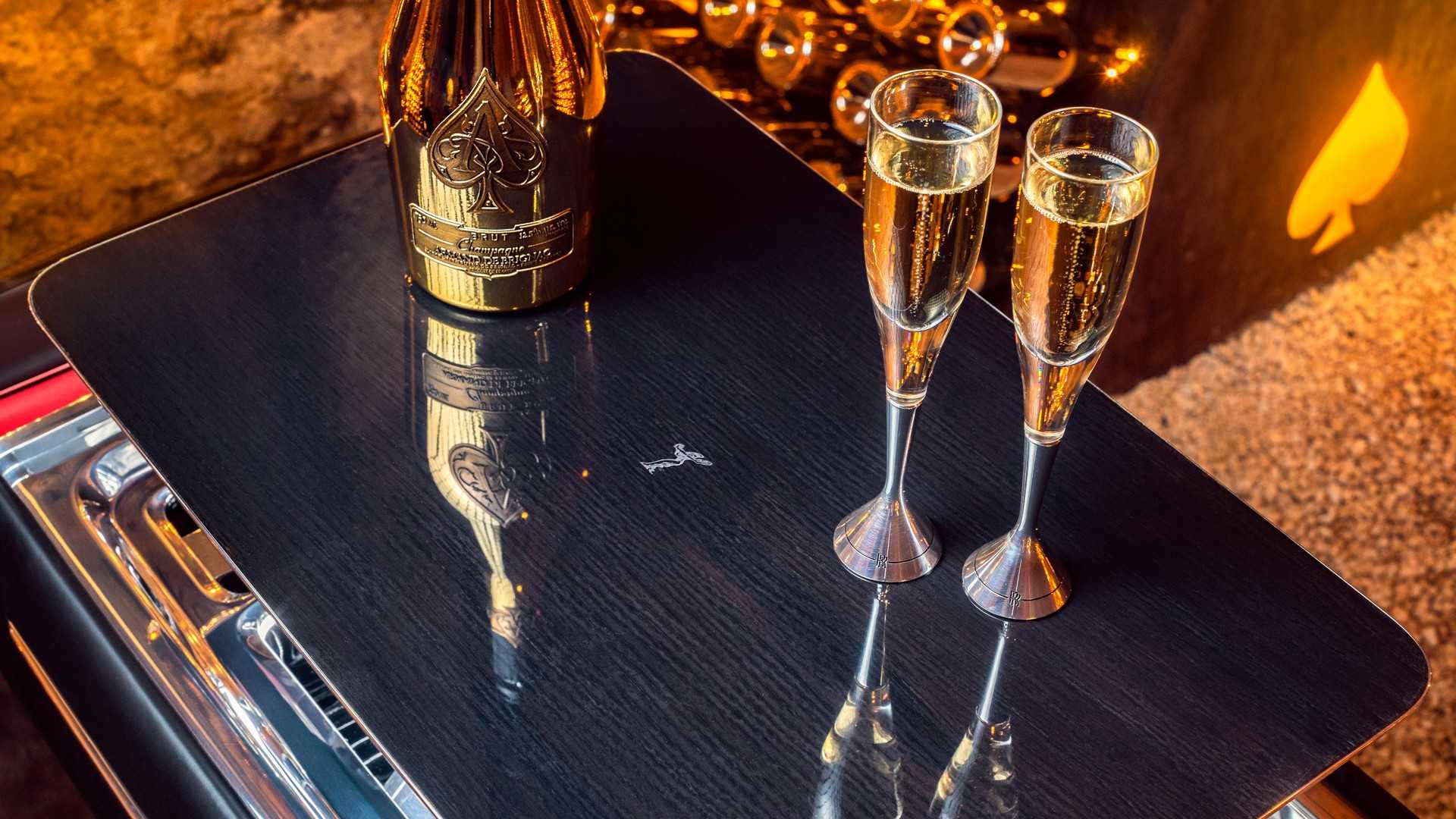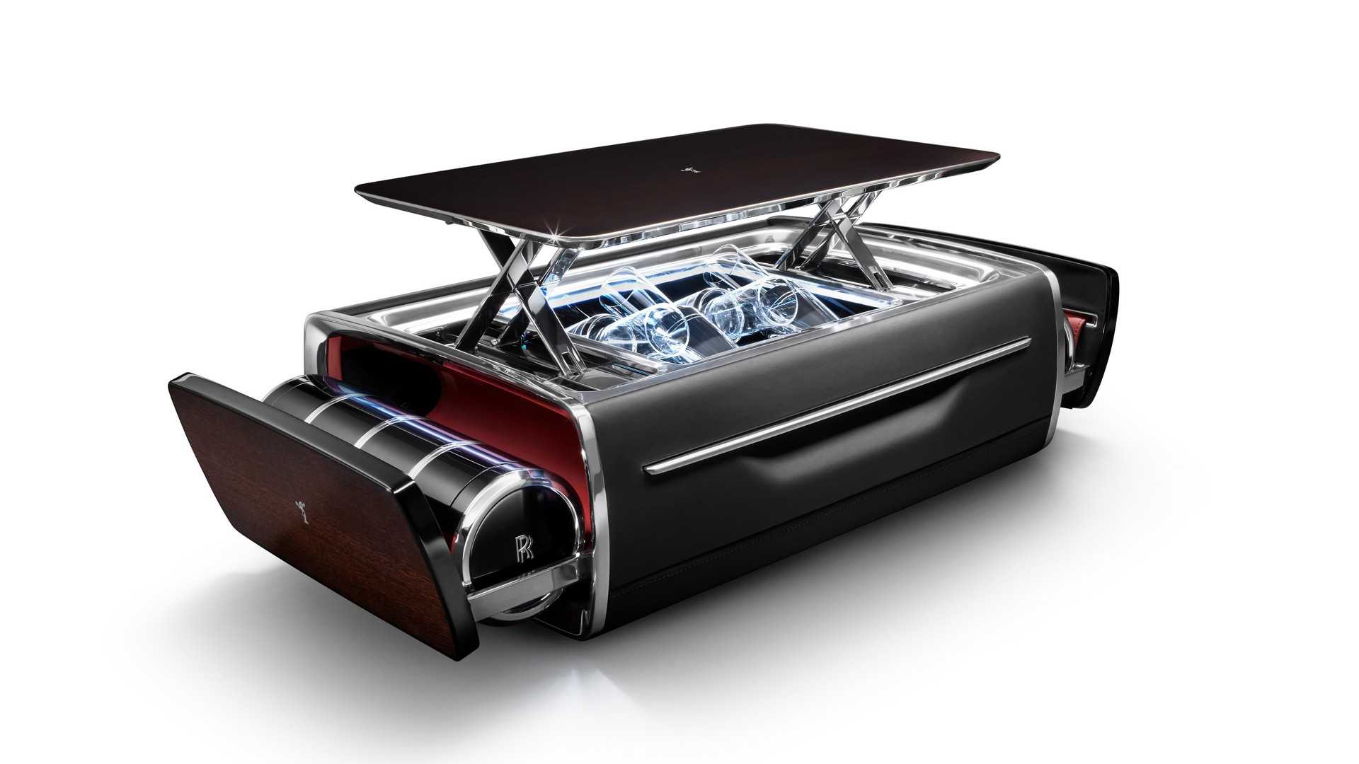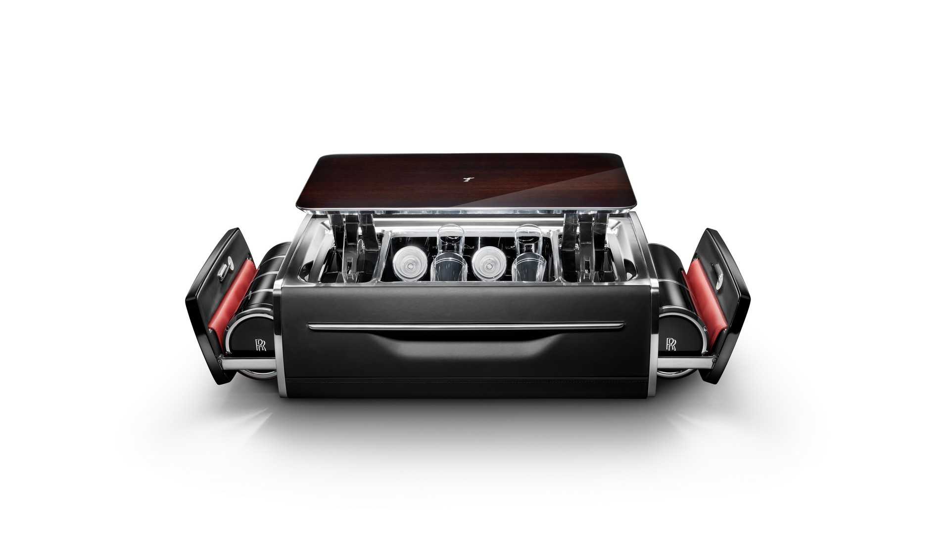 또한, 버튼을 눌러, 양쪽 측면 및 상판을 열면, 4개의 샴페인 잔이 롤스로이스의 V12 엔진을 연상케 하는 배열로 비스듬히 꽂혀 있으며, 캐비어의 손상을 최소화하는 전용 스푼을 포함해, 최적의 온도로 샴페인과 캐비어를 보관해준다. 이 샴페인 케이스의 가격은 한화로 약 5,552만원이다.