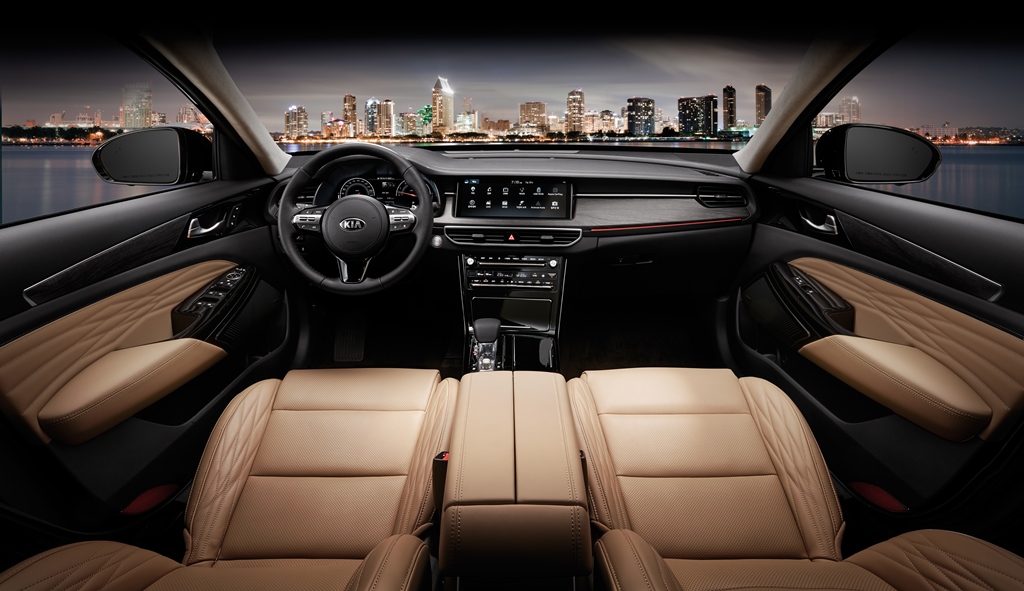 K7 프리미어의 실내에는 자동 무선 업데이트(OTA, Overe the Air) 기능을 지원하는 12.3인치 대화면 AVN rhk 12.3인치 풀 컬러 TFT LCD 클러스터와 전자식 변속레버(SBW)가 적용되었으며, 차량과 집을 쌍방향으로 연결하는 카투홈/홈투카(Car to Home/Home to Car) 기능을 국내 최초로 동시에 적용시켜 차 안에서 집안의 조명과 에어컨 등의 사물인터넷(IoT)기기를 제어하는 것과 동시에, 차량의 시동 및 공조장치 등을 제어할 수 있다.