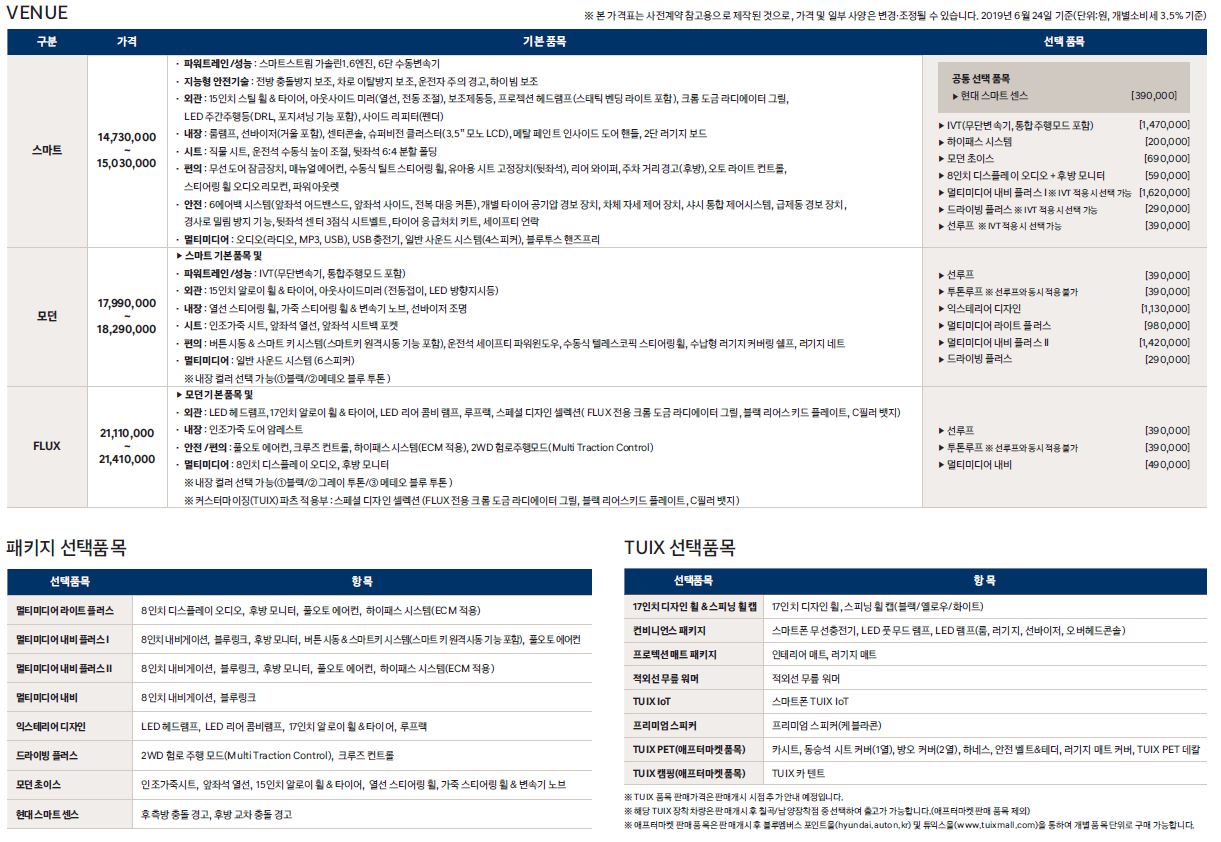 현대자동차의 엔트리 SUV 베뉴(VENUE) 가 24일부터 사전계약을 시작했다. 1.6 가솔린 모델 스마트, 모던, FLUX 총 3가지 트림으로 운영되는 베뉴는 스마트 1,473만원~1,503만원(MT), 1,620만원~1,650만원(무단변속기 기준)이며, 모던 트림은 1,799만원~1,829만원, FLUX 트림은 2,111만원~2,141만원의 가격을 보인다고 한다.(개별소비세 3.5% 기준)