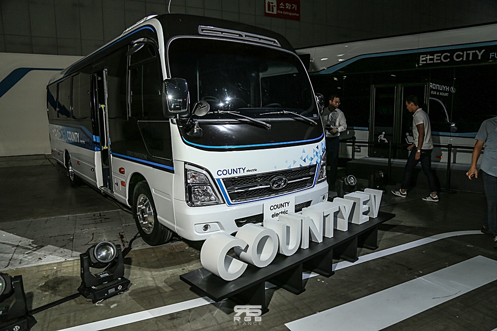 카운티 EV 는 기존 디젤모델보다 60cm 가 늘어난 모델로, 128kWh 대용량 배터리로 1회 충전으로 200km 이상의 거리를 주행할 수 있으며, 72분만에 완충이 가능하고, 마을버스로 주로 이용되는 카운티의 특성을 고려하여 눈길이나 빗길 안전운전을 돕는 차량자세제어장치와 4륜 디스크 브레이크, 차량 후방 비상도어 등을 적용했다. 그리고, 실내에는 7인치 LCD 클러스터와 버튼식 기어레버를 적용한 것이 특징이다.