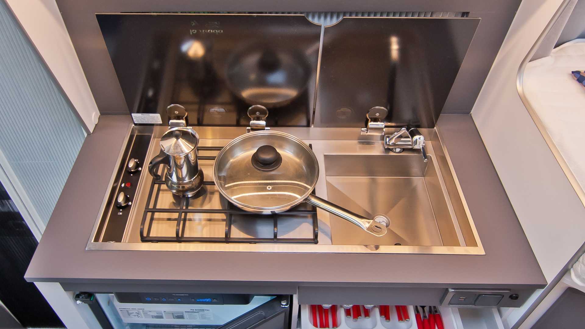 물론, 캠핑카답게 주방도 달려있는데, 2개의 버너 스토브와 싱크대 및 냉장고가 있으며, 화장실도 갖추고 있다