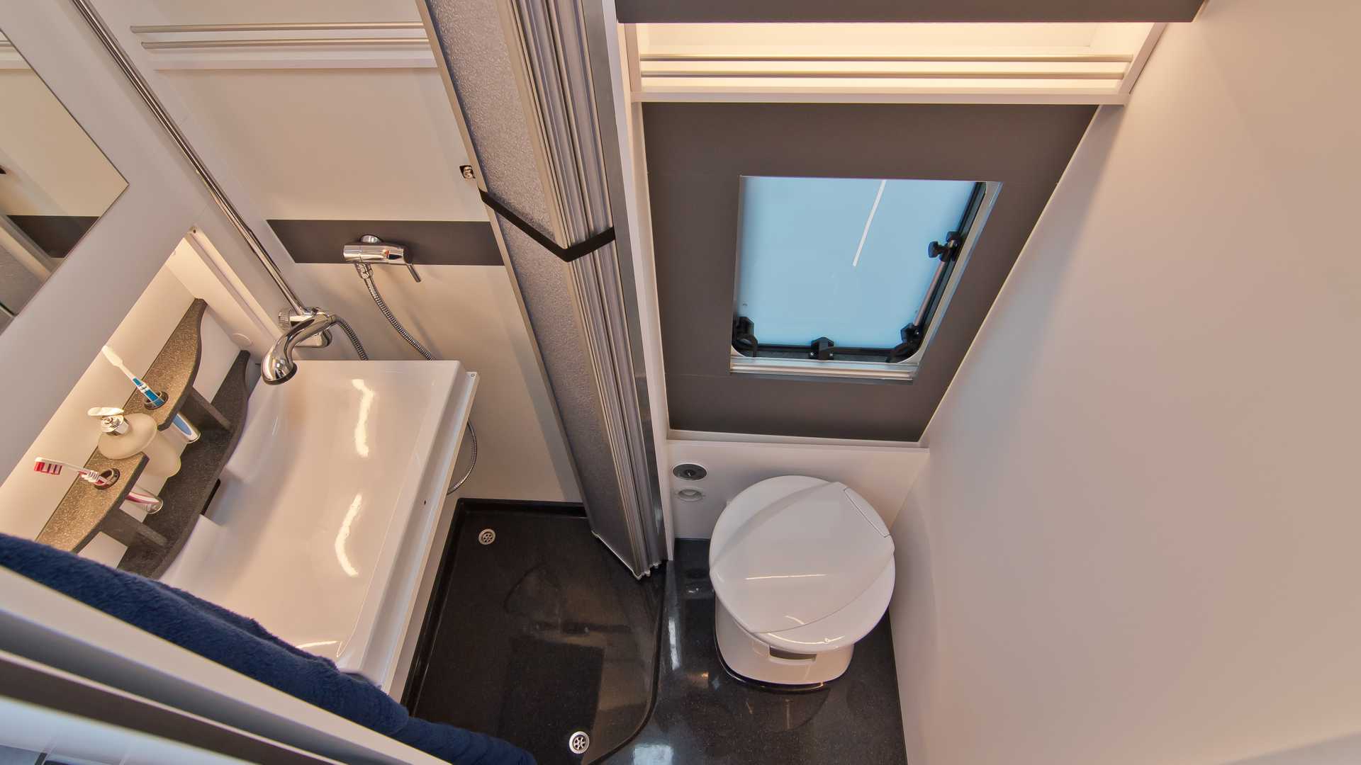 크기는 작지만, 변기와 함께 샤워시설과 접이식 세면대가 있는 것도 공간을 적극적으로 활용하고 있는 것을 볼 수 있으며, 세면대를 접고 샤워를 할 수 있게 칸막이도 제공하고 있다. 집보다는 좁지만, 캠핑을 나가서도 집처럼 웬만한 편의시설을 이용할 수 있게 설계되었다.