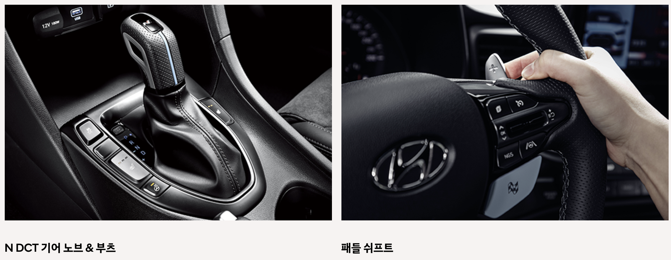 N DCT 패키지는 N 전용 8단 습식 DCT, 패들쉬프트와 DCT 전용 변속 프로그램을 포함해 250만원이며, 피렐리 타이어, 엔진 출력 강화(250마력 →275마력), 19인치 알로이 휠, e-LSD, N 전용 고성능 브레이크, 능동 가변 배기 시스템 등으로 구성된 퍼포먼스 패키지는 200만원이 추가된다.