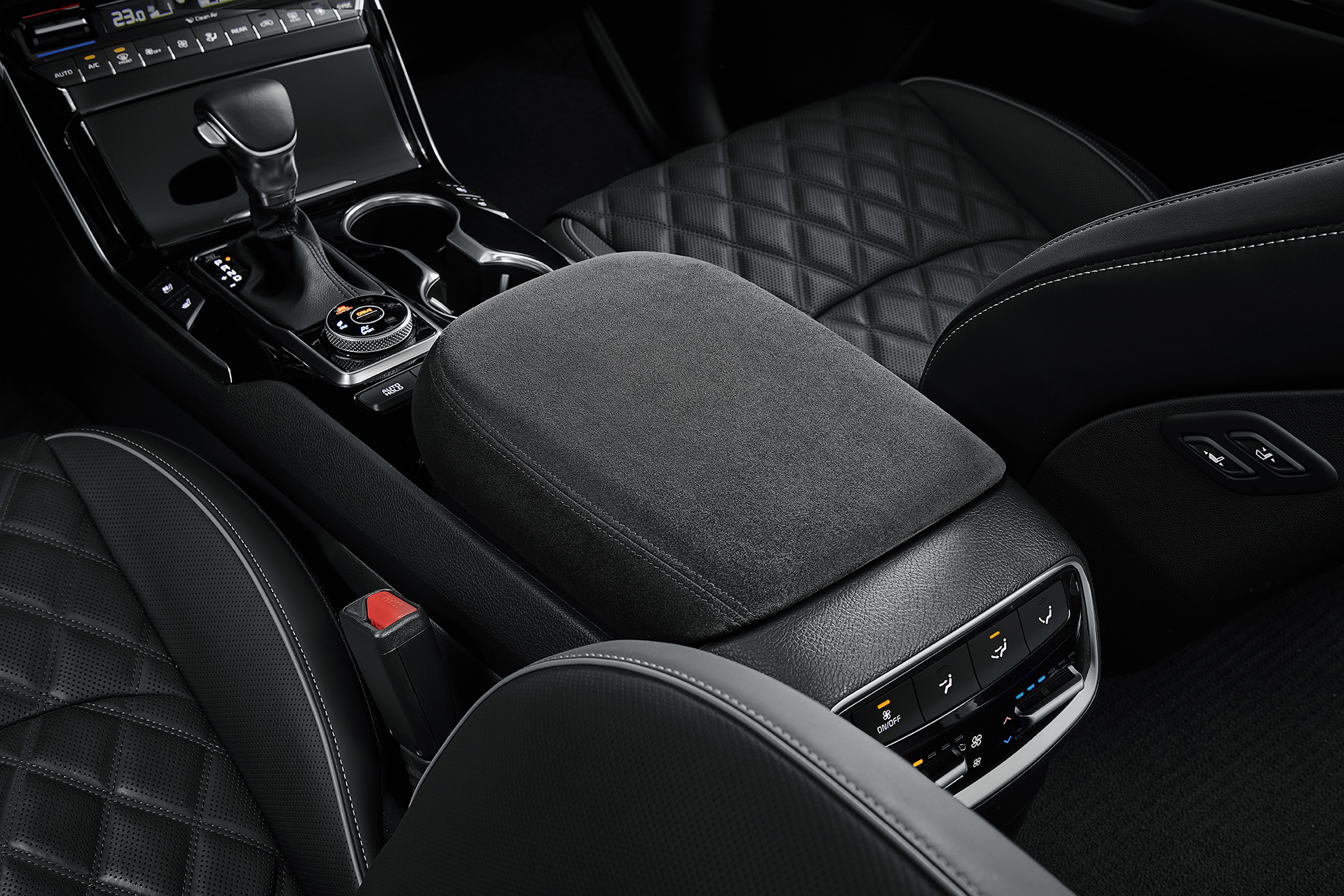 모하비 더 마스터 그래비티의 실내에서 눈에 띄는 변화는 스티어링 휠과 센터콘솔, 1/2열 도어 암레스트 및 도어 센터 트림에 '알칸타라' 를 사용했다는 점이다. 고급스러움을 한층 돋보이게 만드는 소재로 부드러운 질감과 내구성이 좋아 고급차량에 많이 적용되는 소재 중 하나다.