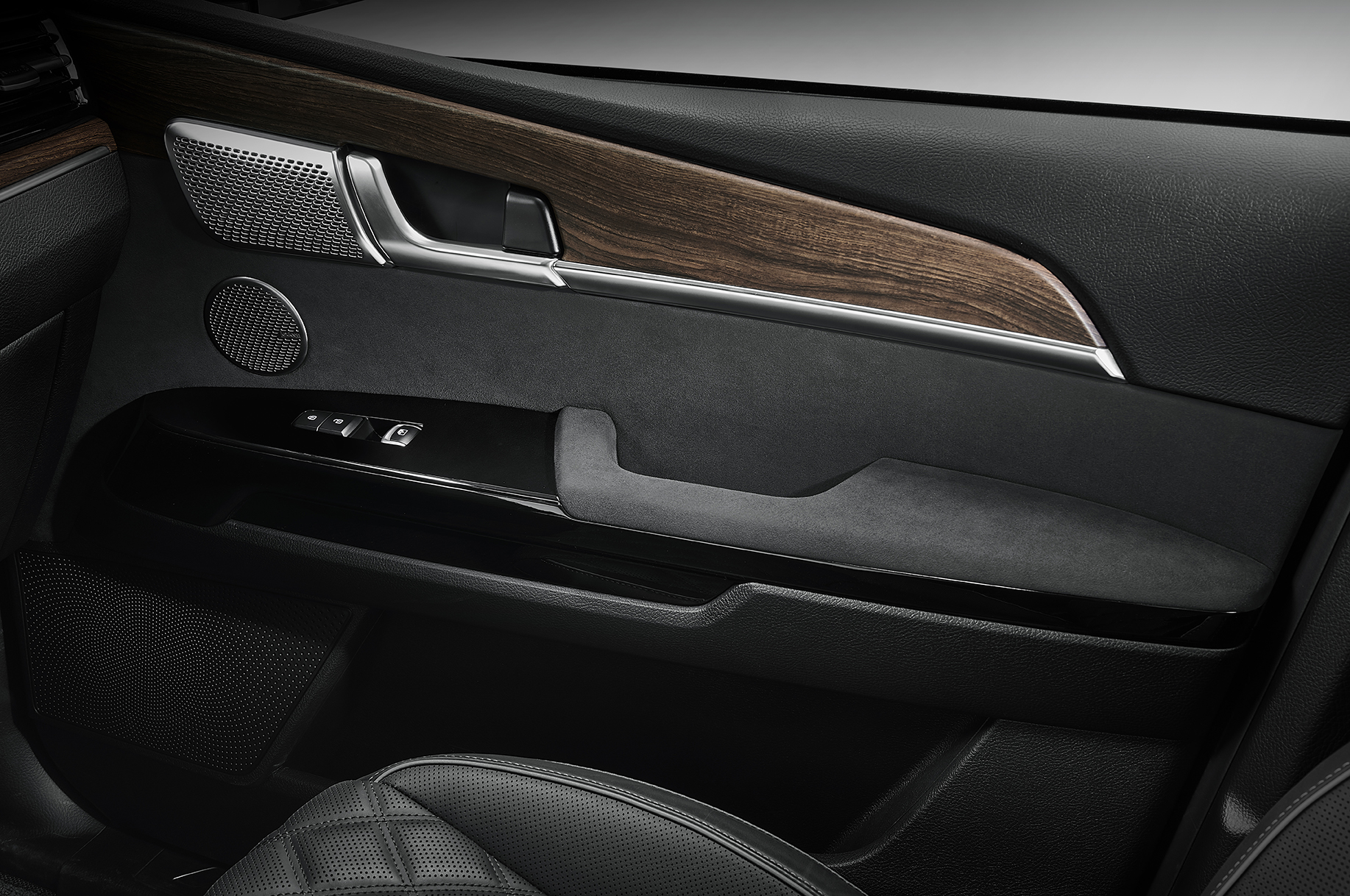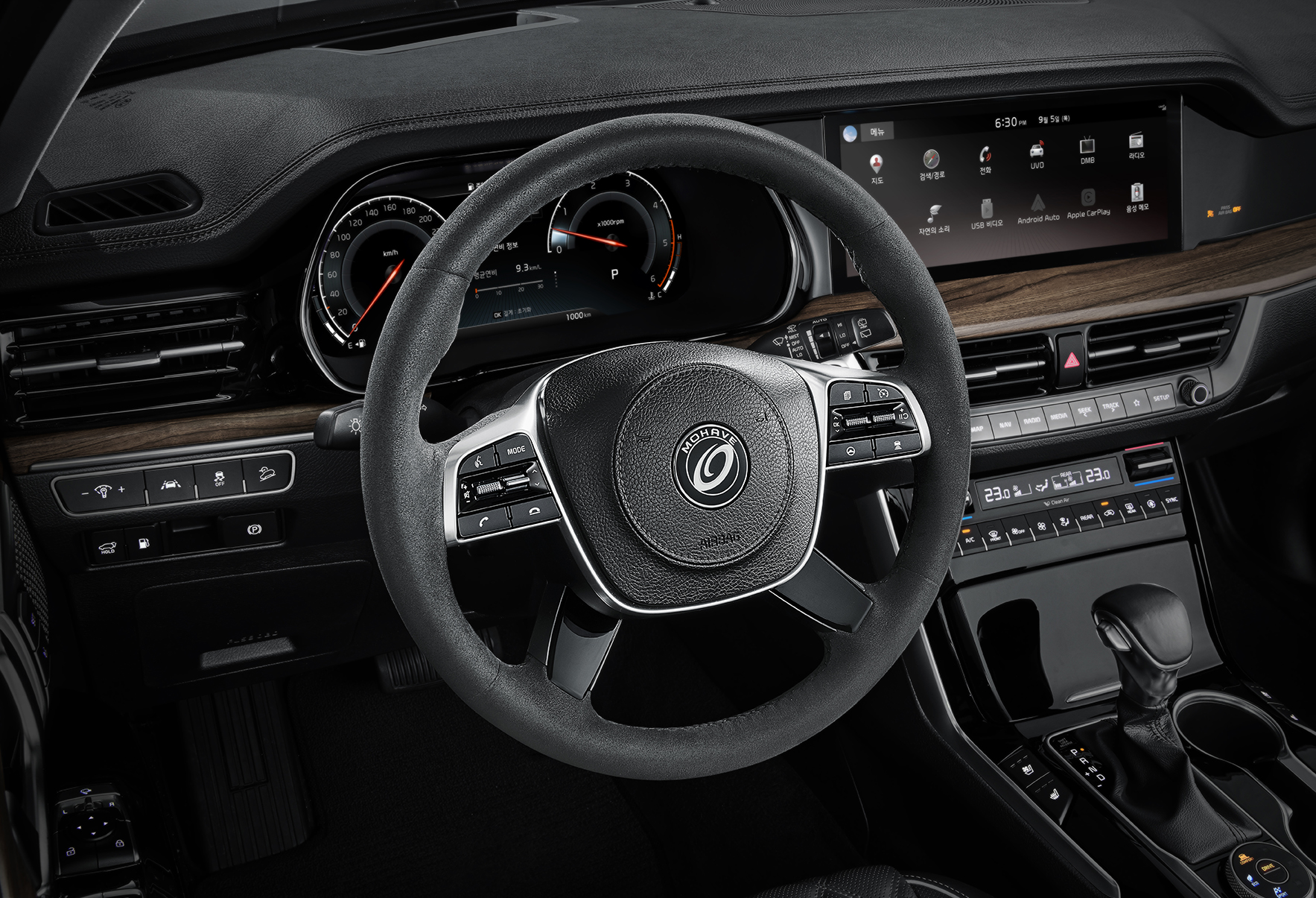 모하비 더 마스터 그래비티의 실내에서 눈에 띄는 변화는 스티어링 휠과 센터콘솔, 1/2열 도어 암레스트 및 도어 센터 트림에 '알칸타라' 를 사용했다는 점이다. 고급스러움을 한층 돋보이게 만드는 소재로 부드러운 질감과 내구성이 좋아 고급차량에 많이 적용되는 소재 중 하나다.