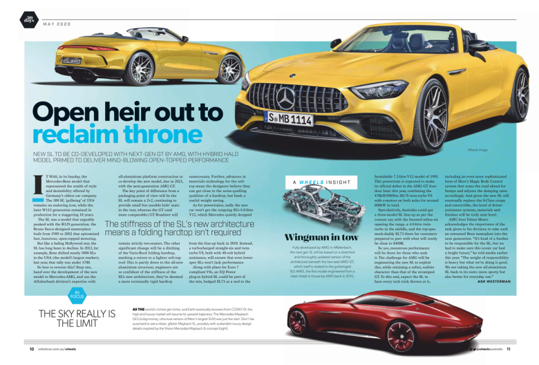 2021년에 공개될 예정인 벤츠 SL 이 AMG 주도하에 만들어지며, 하드톱이 아닌, 소프트톱 방식으로 새롭게 만들어질 예정이라고 한다. 아직 정확하게 공개된 것이 없어 예상 랜더링만 돌고 있지만, 메르세데스-벤츠가 아닌, 메르세데스-AMG 로 만들어지고 있으며, AMG 본사가 위치한 독일 아펠터바흐(Affalterbach) 에서 설계를 진행했다고 한다.