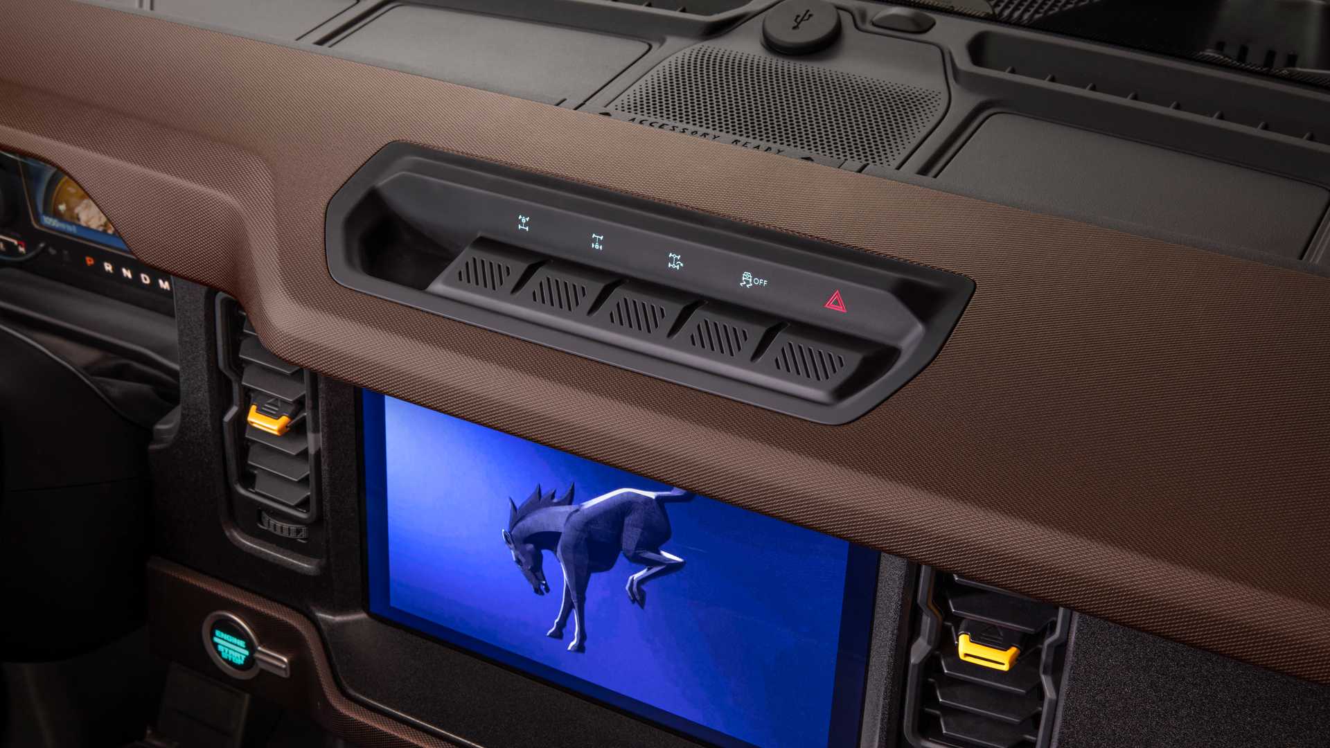 센터페시아 중앙에는 12.0인치의 터치스크린이 들어가 았고, 안드로이드 오토와 무선 애플 카플레이(CarPlay) 가 사용 가능하며, 오프로더를 위해 트레일 트레킹 시스템과 지도가 포함된 앱도 제공된다고 한다. 기본 사양에는 8인치 스크린이 적용되며, 스티어링휠의 야생마 엠블럼과 크래시패드 및 시트 등받이에도 브롱코 레터링을 더해 정체성을 확실하게 해주고 있다.