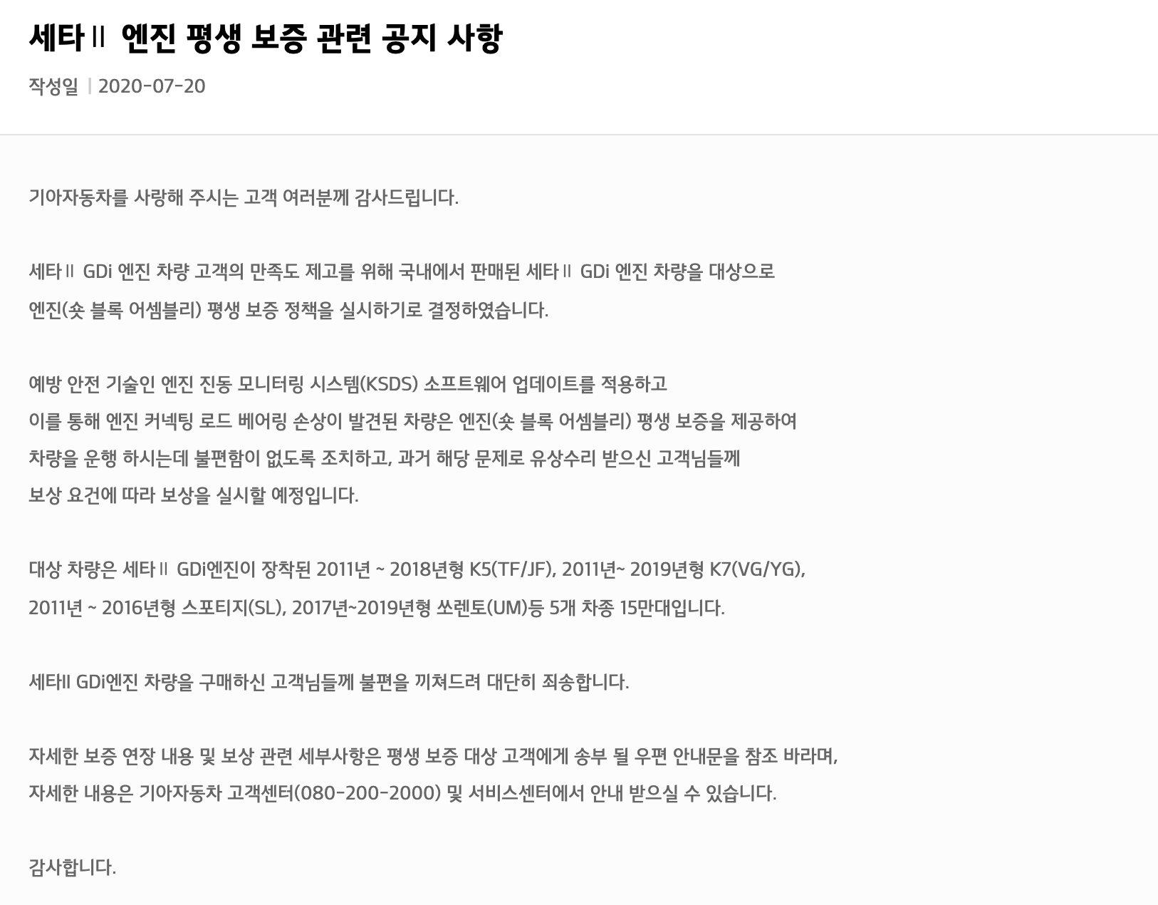 현대기아차가 지난 2019년 미국에서 시작된 세타II GDi 엔진의 결함 관련 집단소송과 관련해 합의를 하면서, 국내에서도 평생 보증을 실시한다고 한다. 9개월만의 일이며, 세타 II GDi 엔진의 평생보증과 관련하여 홈페이지에 공지하고, 대상 고객에게 별도의 우편 안내문을 순차적으로 발송할 예정이라고 한다.