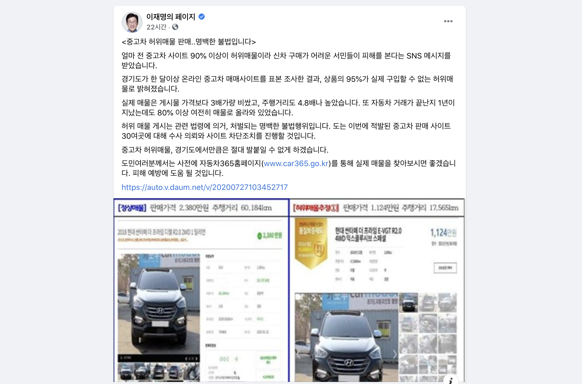 경기도에서 중고차의 허위매물을 없애는데 앞장선다고 한다. 이재명 경기도지사는 지난 6월 5일부터 7월 24일까지 조사를 통해 허위매물 판매가 의심되는 온라인 중고차 매매사이트 31곳의 판매상품을 표본 조사했고, 95% 가 허위매물인 것으로 밝혀냈다. 경기도는 사업자 정보와 차량 시세 등의 내용이 부실한 사이트 당 100 대를 임의 추출할 뒤 자동차 등록 원부와 대조하는 방식으로 조사를 했으며, 허위매물로 밝혀진 곳에 경찰 수사의뢰와 함께 방송통신심의위원회 등에 차단조치를 요청할 예정이라고 한다.