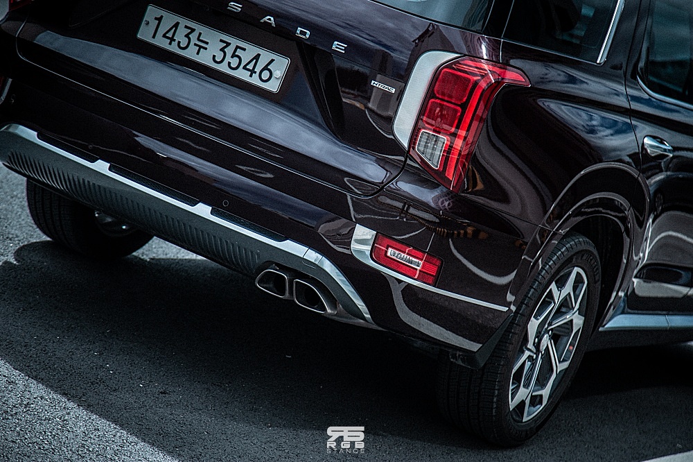 팰리세이드 캘리그래피는 입체 크롬 매쉬타입의 대형 캐스캐이딩 그릴로 바뀌었다.그리고, 바디컬러 크래딩이 적용되어 일체감이  높아졌으며, 리어 크롬 스키드 플레이트를 적용해서 더욱 와이드한 모습을 보여주고 있으며, 외장 컬러가 추가되었다는  캘리그래피 전용 20인치 휠이 사용되었다는  달라진 모습이다. (*캘리그래피 전용 컬러는 레인 포레스트)