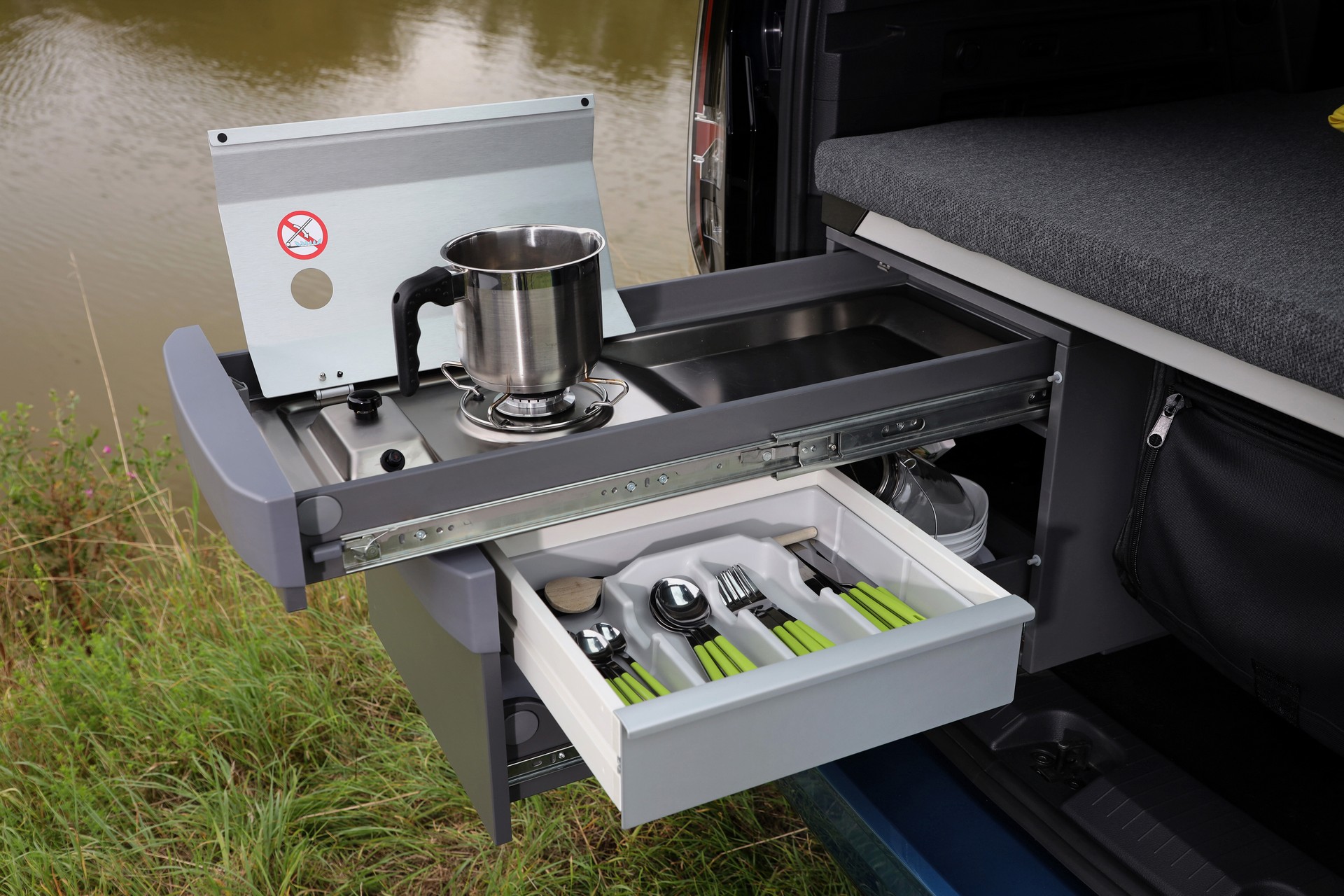 캠핑이라면, 먹는 것이 빠질 수 없는데, 트렁크쪽에 해치를 열면, 간단히 꺼내 사용할 수 있는 '미니주방' 이 나오는데, 가스 쿡탑과 바람막이가 있는 상단 부분에 슬라이드를 사용해 상하단 주방을 사용할 수 있으며, 수저나 쟁반, 조리기구 및 음식 등을 보관할 수 있는 공간이 있으며, 인적이 드문 곳에서 캠핑을 즐기는 사람을 위해 사륜구동 시스템이 적용되어 웬만한 길을 거침없이 다닐 수 있다.