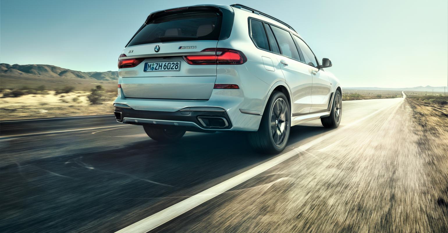 BMW X7 M50i 는 세륨 그레이 컬러가 적용된 M 퍼포먼스 전용 키드니 그릴과 사이드미러 커버, 머플러 팁, 22인치 휠 등 M 퍼포먼스만의 디자인 요소가 적용되어 역동적인 성능을 강조하고 있다.