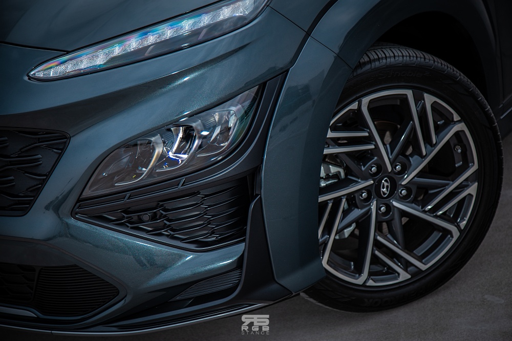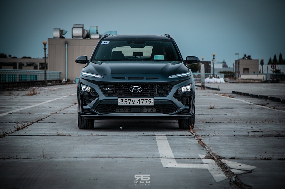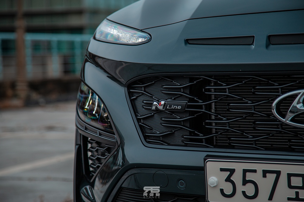 다시 코나 이야기를 하자면, N line 모델은 메시타입의 프론트 그릴이 다이나믹함을 느끼게 해주며, 본넷쪽에 에어홀을 만들어 놓아 강렬함을 보여준다. 실제 구멍이 뚫려있진 않았지만, 디자인적으로 일반 가솔린 터보나 하이브리드 모델과는 구별되는 모습이며, N 라인 전용 범퍼 디자인과 바디 컬러가 적용된 클래딩이 차량을 더욱 근육질의 모습으로 만들어주어 스타일리시하다.