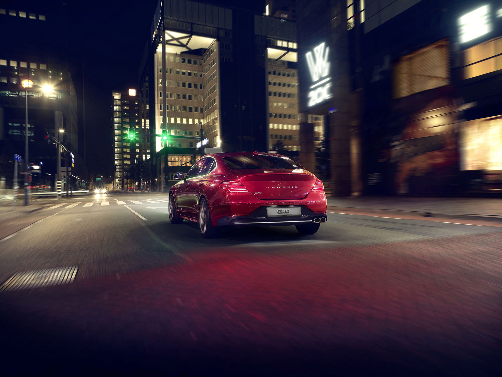 후면부의 쿼드램프 역시 제네시스의 정체성을 보여주며, 듀얼 머플러와 차체와 동일한 색상의 리어 디퓨저가 고성능 세단다운 모습을 보여주고 있다.