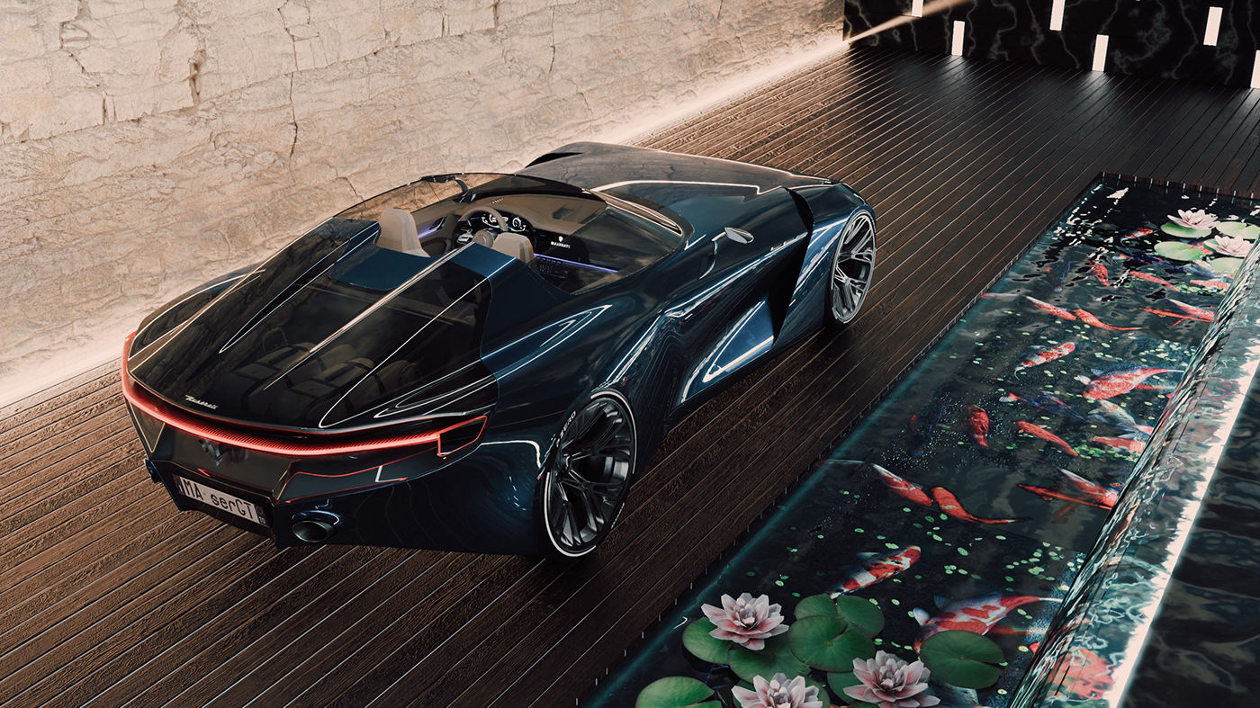 Samuele Errico Piccarini 는 마세라티 5000 GT 에서 영감을 받아 플로팅 타입의 루프 디자인을 했으며, 마세라티의 커다란 프론트 그릴과 함께, 얇은 LED 헤드라이트와 반원형태의 DRL 이 강렬한 인상을 심어주고, 리어는 하나로 연결된 LED 라이트 바가 와이드한 모습을 더해준다. 여기에 배기구의 모습도 독특하고, 트렁크는 유리로 만들어져 맞춤형 가죽 가방을 통해 깔끔한 모습과 동시에 멋스러움을 표현해준다.